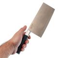 Рукоять круглая, без сложной формы и острых граней. За счёт этого нож не утомляет руку даже при долгой шинковке. Баланс смещён к клинку, что помогает контролировать движение и снижает нагрузку на кисть.