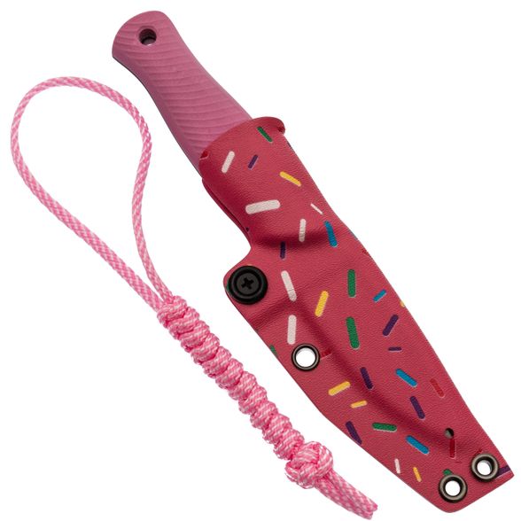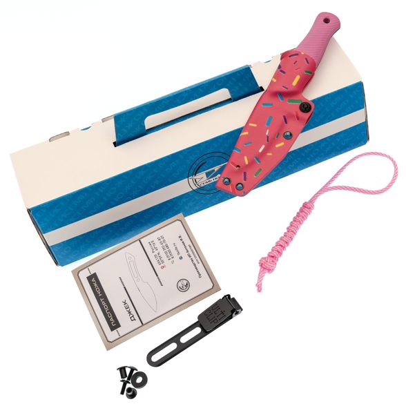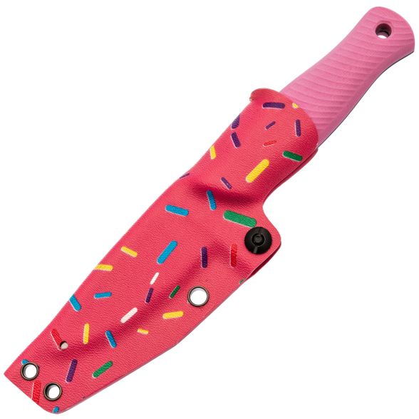 Ножны из Kydex выполнены в той же "пончиковой" расцветке - ярко и нестандартно, но без потери практичности. Они плотно удерживают клинок и не боятся ни влаги, ни ударов. В комплект входит крепление Ulti-Clip, с которым "Колибри" можно надёжно разместить на ремне, кармане, рюкзаке или сумке - так, как удобно именно вам.