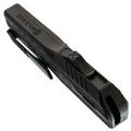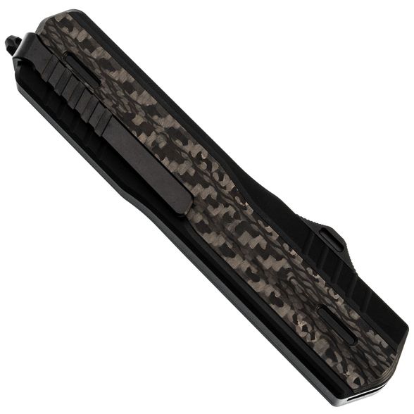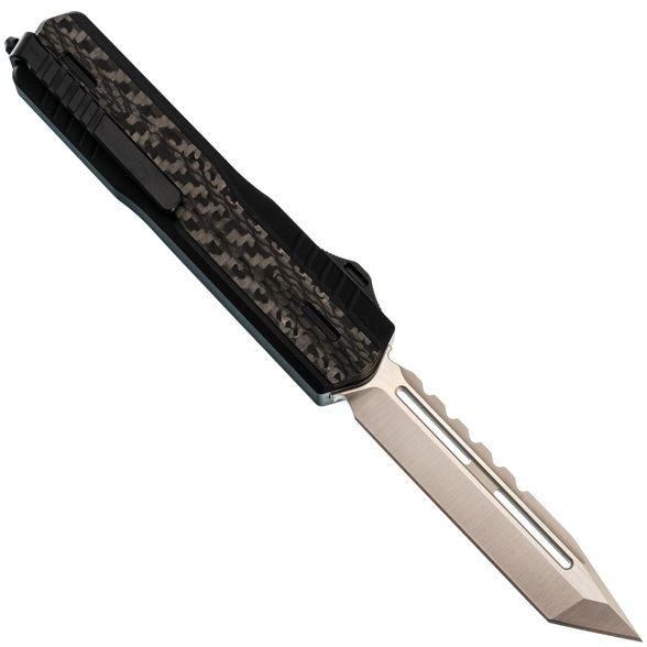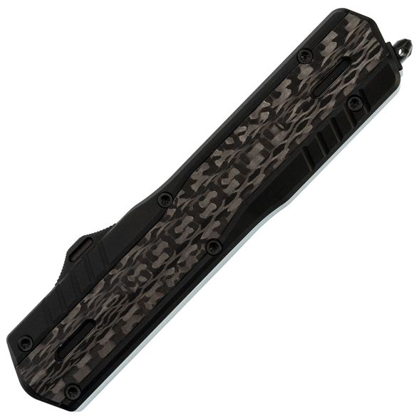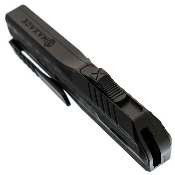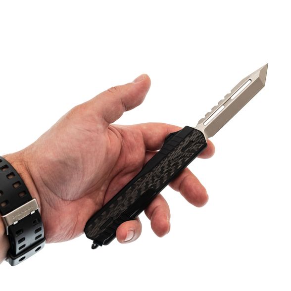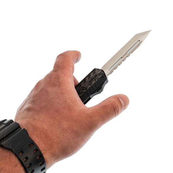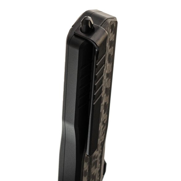 Рукоять ножа выполнена из прочного авиационного алюминия с вставками из карбона, что обеспечивает легкий вес и высокую прочность. Ее футуристичный дизайн придает инструменту современный вид. Кроме того, рукоять оснащена клипсой глубокой посадки и стеклобоем, который можно использовать как куботан. Эти элементы делают нож удобным и функциональным аксессуаром для повседневного использования.