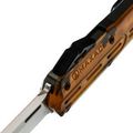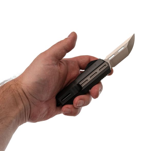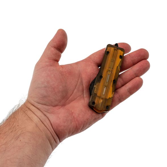 Авиционный алюминий — основа конструкции, прочный и лёгкий. Титановые вставки подчеркивают технологичный стиль, а лицевая сторона рукояти выполнена из PEI (Ultem) — уникального термопластика с высокой прозрачностью. Этот материал не только прочен, но и позволяет видеть механизмы ножа в действии — словно инженерное произведение искусства.