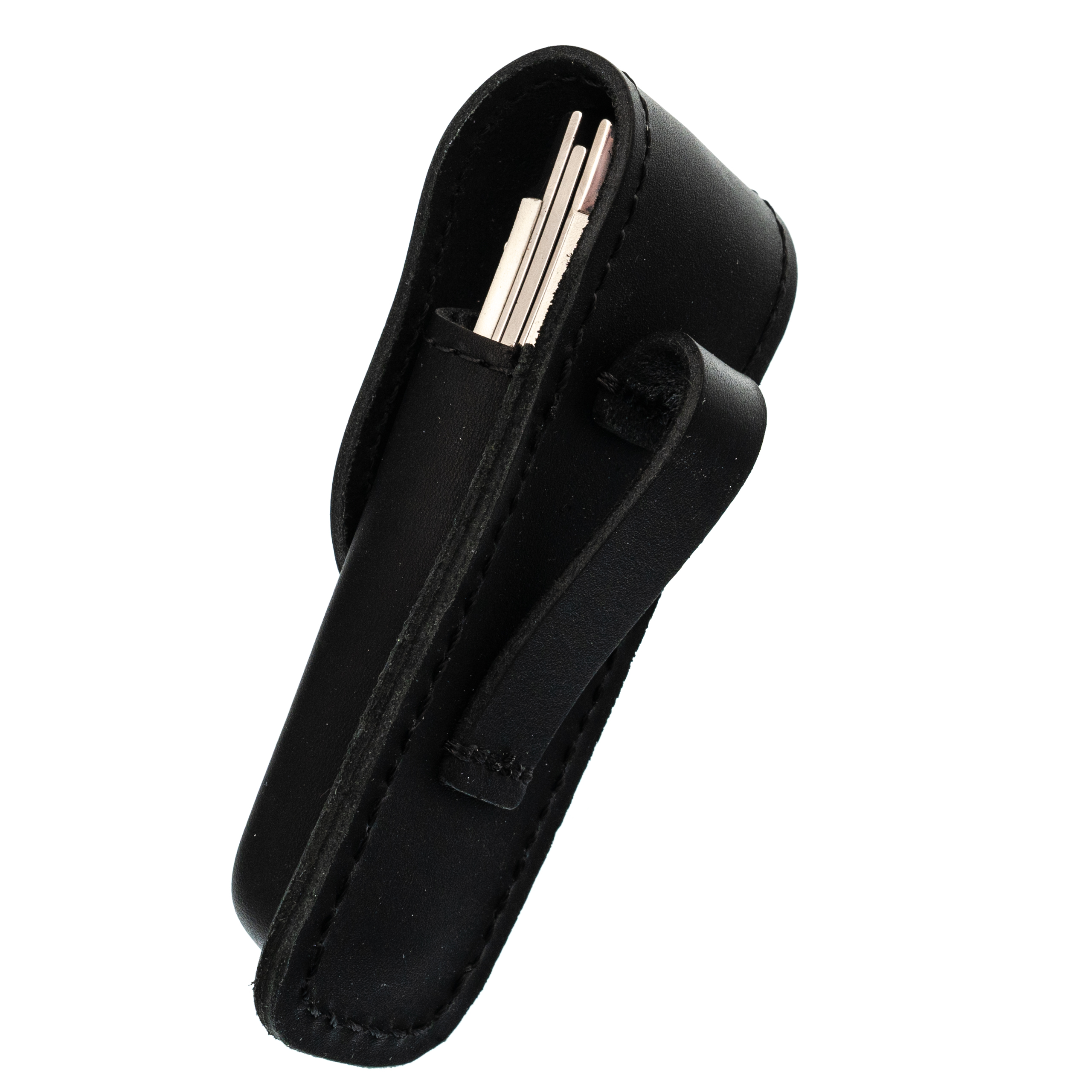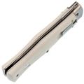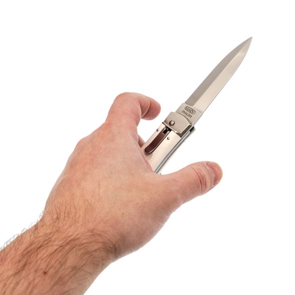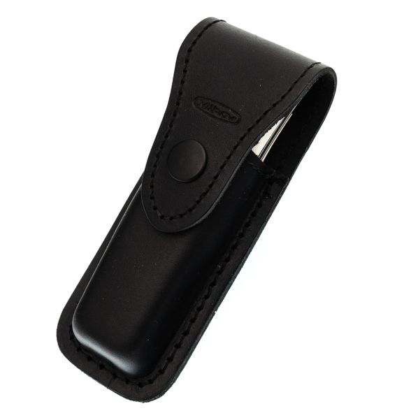 Автоматика Mikov реализована на высшем уровне. Чтобы активировать пружину, нужно отжать подпальцевую планку (это и есть замок Lever-Lock) вперёд до упора. Как только вы нажмёте на неё, клинок мощно вылетит из рукояти. Закрывается нож одной рукой: отжимаете планку, складываете лезвие. Система абсолютно безопасна для повседневного ношения. В комплекте, как и полагается хорошему ножу, идёт кожаный чехол. Он носится на ремне, закрывается на надёжную кнопку. Цвет чехла - чёрный или коричневый, зависит от партии.