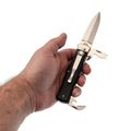 Рукоять нейтральной формы не навязывает один-единственный хват. Lever-Lock - фирменная система: планка в покое прилегает к рукояти, а для открытия её отводят и нажимают. Закрытие такое же спокойное - клинок двигается только по команде пользователя.