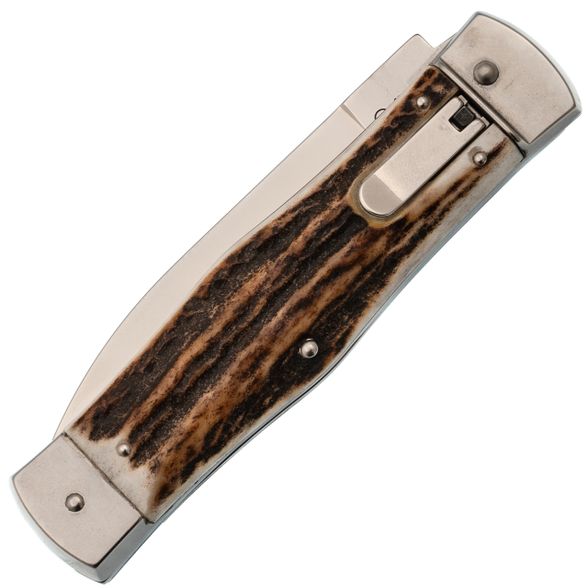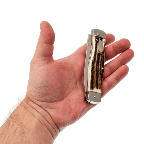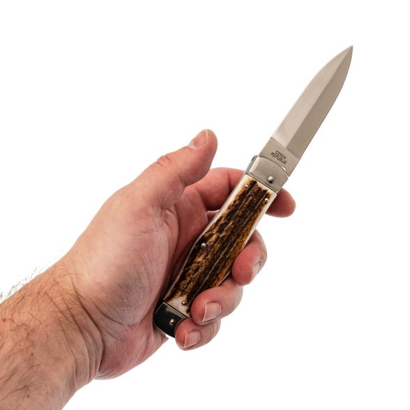 - Олений рог (рукоять) - натуральный материал с уникальной текстурой: каждая рукоять выглядит по-своему. В ладони ощущается сухо и цепко, особенно когда нужна уверенность хвата.