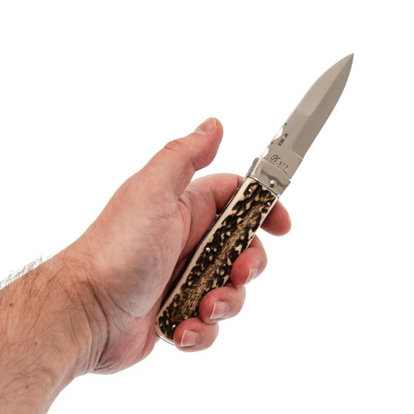 Нейтральная рукоять хорошо ложится в ладонь. Фирменный Lever-Lock работает через планку: в покое она прилегает к рукояти, а чтобы открыть - её отгибают до упора и нажимают. Никаких случайностей - механизм срабатывает только по вашему действию.