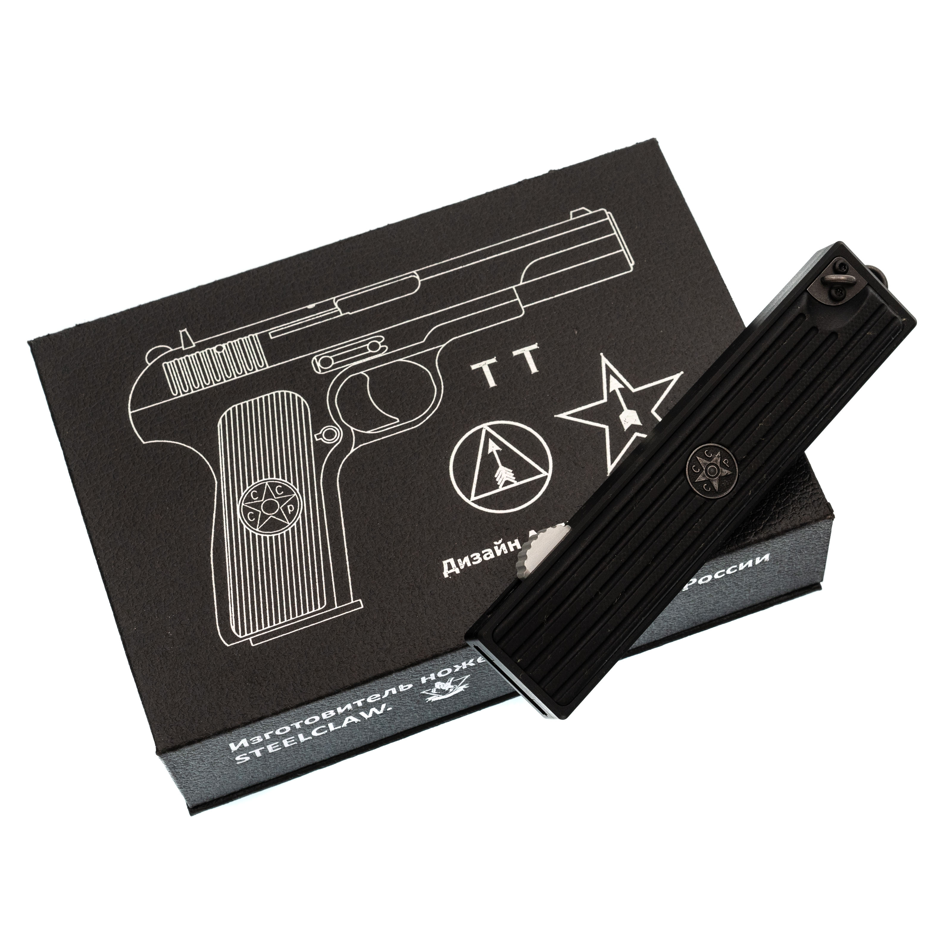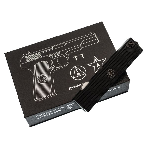 Steelclaw ТТ2 - фронтальный автоматический нож с чётким характером и понятной философией. В его облике легко угадываются мотивы легендарного советского пистолета времён Великой Отечественной войны, но здесь это не копирование, а аккуратная стилизация. Нож сделан как надёжный рабочий инструмент на каждый день: компактный, быстрый в использовании и собранный без лишних усложнений. Он одинаково уместен и в кармане, и в реальных бытовых задачах.