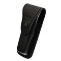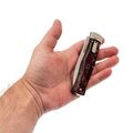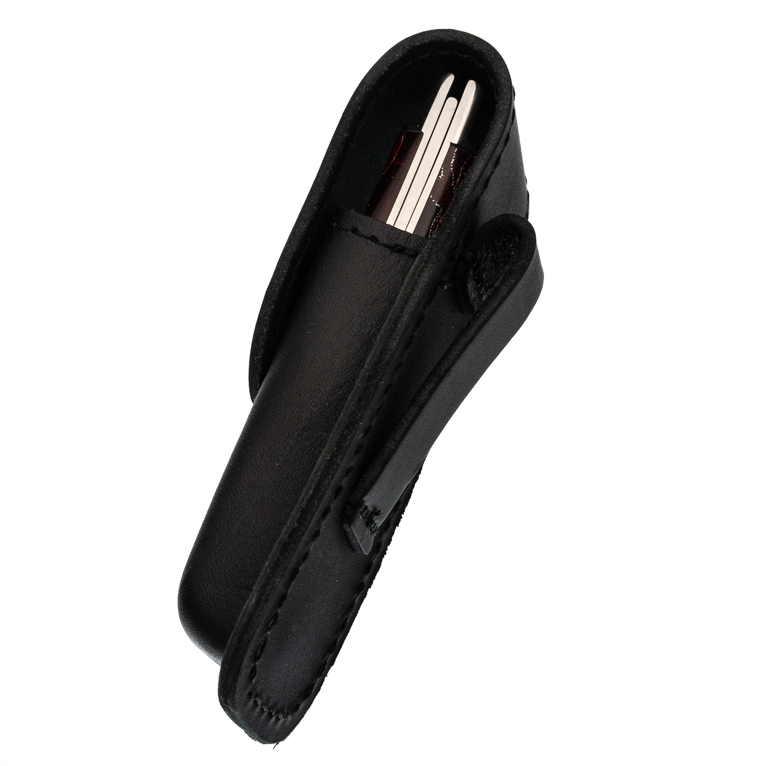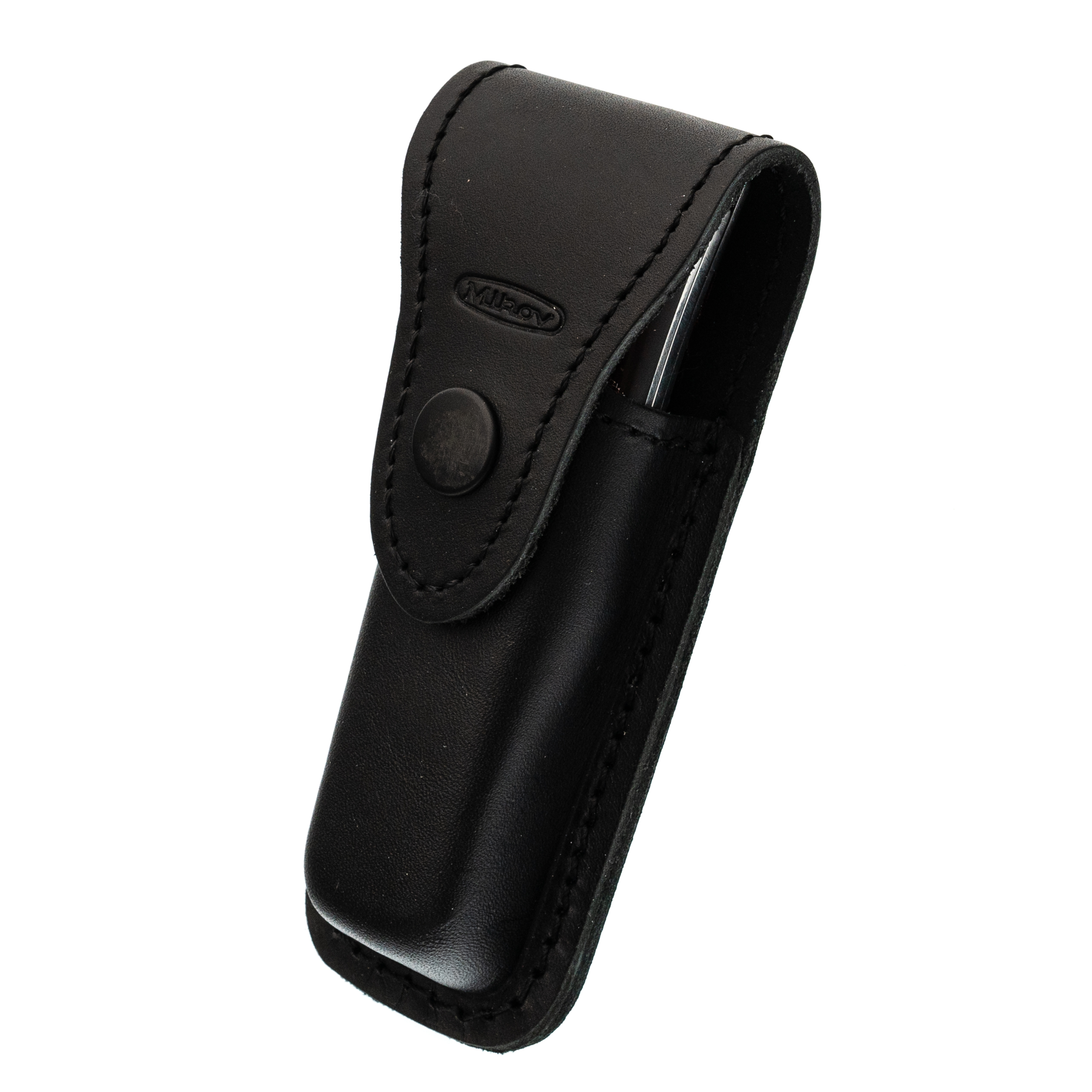 В основе механики - легендарный замок Lever-Lock. Чтобы достать нож, нужно отжать рычаг-планку от рукояти и нажать на него. Механизм срабатывает чётко, без осечек. В сложенном состоянии планка прилегает плотно, ничего не цепляется за карман. В комплекте с ножом идёт кожаный чехол, рассчитанный на ношение на ремне. Чехол качественный, с кнопкой. Производитель не уточняет цвет заранее - в коробке вас может ждать как классический чёрный, так и коричневый вариант.