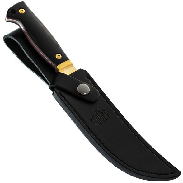 Ножны выполнены из качественной кожи, что добавляет не только стиль, но и надёжность в транспортировке. Жёсткий подвес для ношения на ремне делает носку ножа удобной и безопасной.