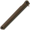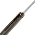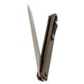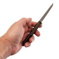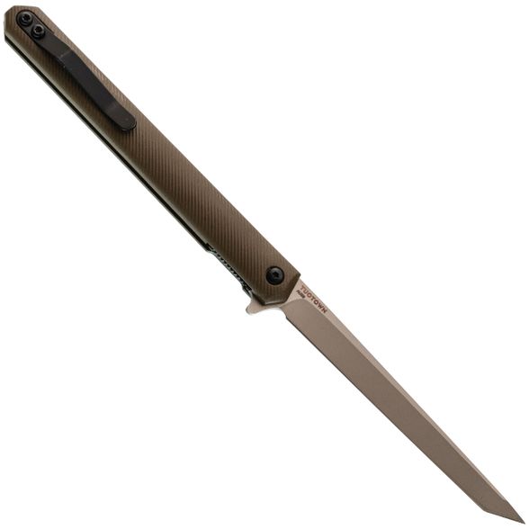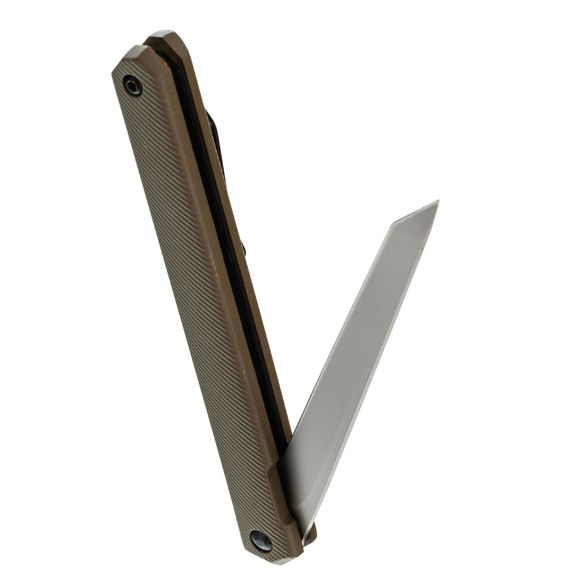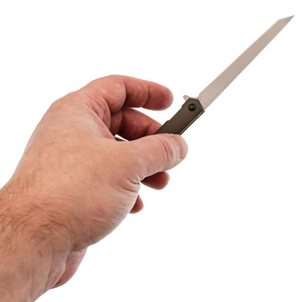 Клинок выполнен в профиле Tanto с прямыми спусками - геометрия, которая хорошо подходит для аккуратной работы по плотным материалам и позволяет уверенно контролировать рез. Отдельный плюс именно этой модели - крайне узкий клинок: он легко пролезает в щели, удобно поддевает край упаковки и даёт ощущение "скальпельной" точности там, где широкий клинок мешает. Открытие - за флиппер: быстро, привычно и удобно одной рукой.