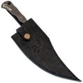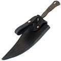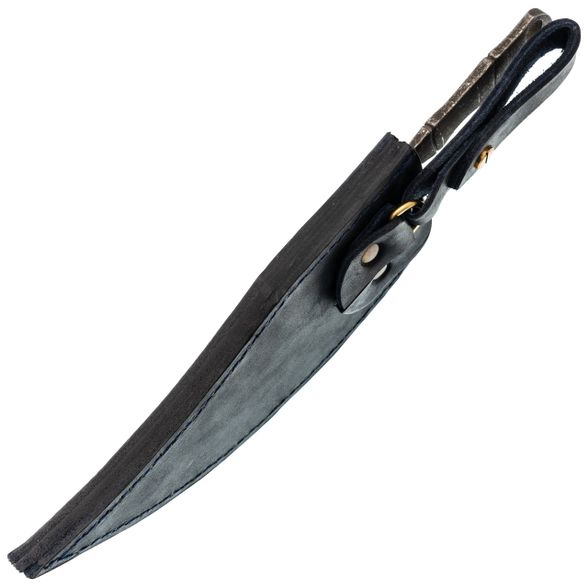 Кожаные ножны оснащены полусвободным подвесом: нож висит на поясе и при ходьбе слегка покачивается, не сковывая движений. Хлястик с защёлкой фиксирует рукоять так, что даже вверх ногами нож останется в ножнах. Кожа плотная, уже промасленная и готовая к использованию. Есть петля для ремня, так что подойдёт под большинство туристических и джинсовых ремней.
