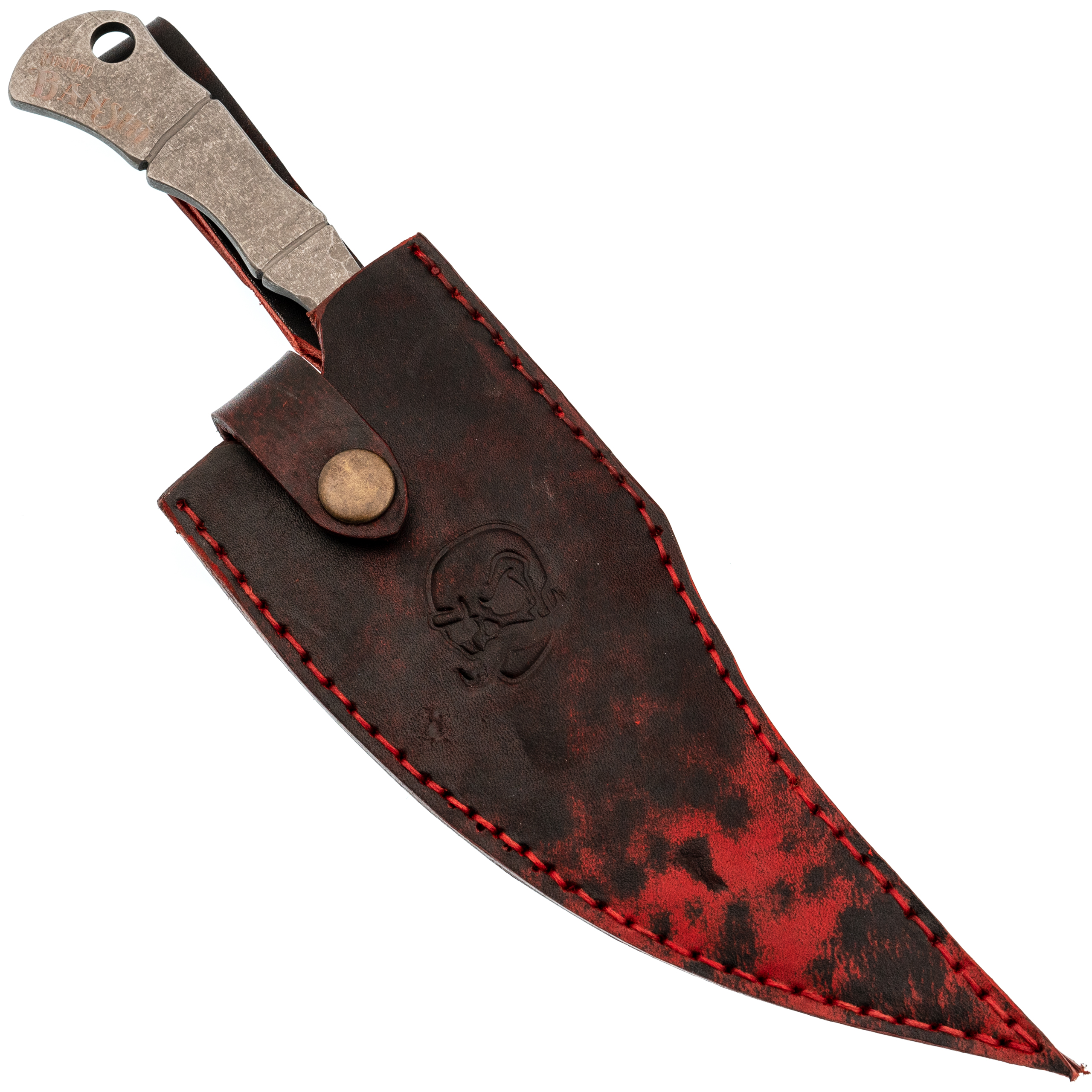 Ножны из натуральной кожи ориентированы на ношение на поясе. Полусвободный подвес позволяет ножу немного двигаться при ходьбе, не мешая, а хлястик с кнопкой фиксирует рукоять - случайно нож не выпадет. Кожа плотная, держит форму на отлично.