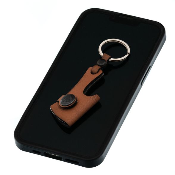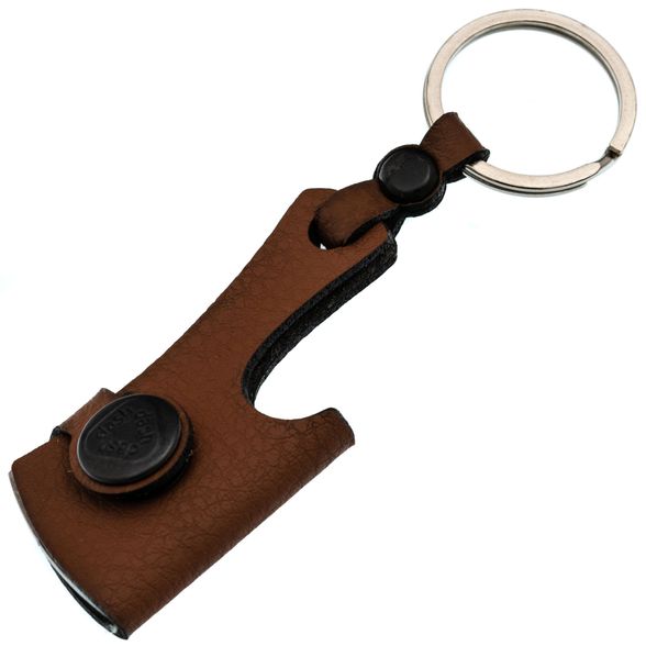 Изготовлен из износостойкой стали Х12МФ, что гарантирует долгий срок службы и сохранение остроты. Хранится в стильном кожаном чехле, обеспечивающем безопасность при ношении. Удобное заводное кольцо позволяет легко закрепить брелок на ключах, рюкзаке или снаряжении.