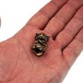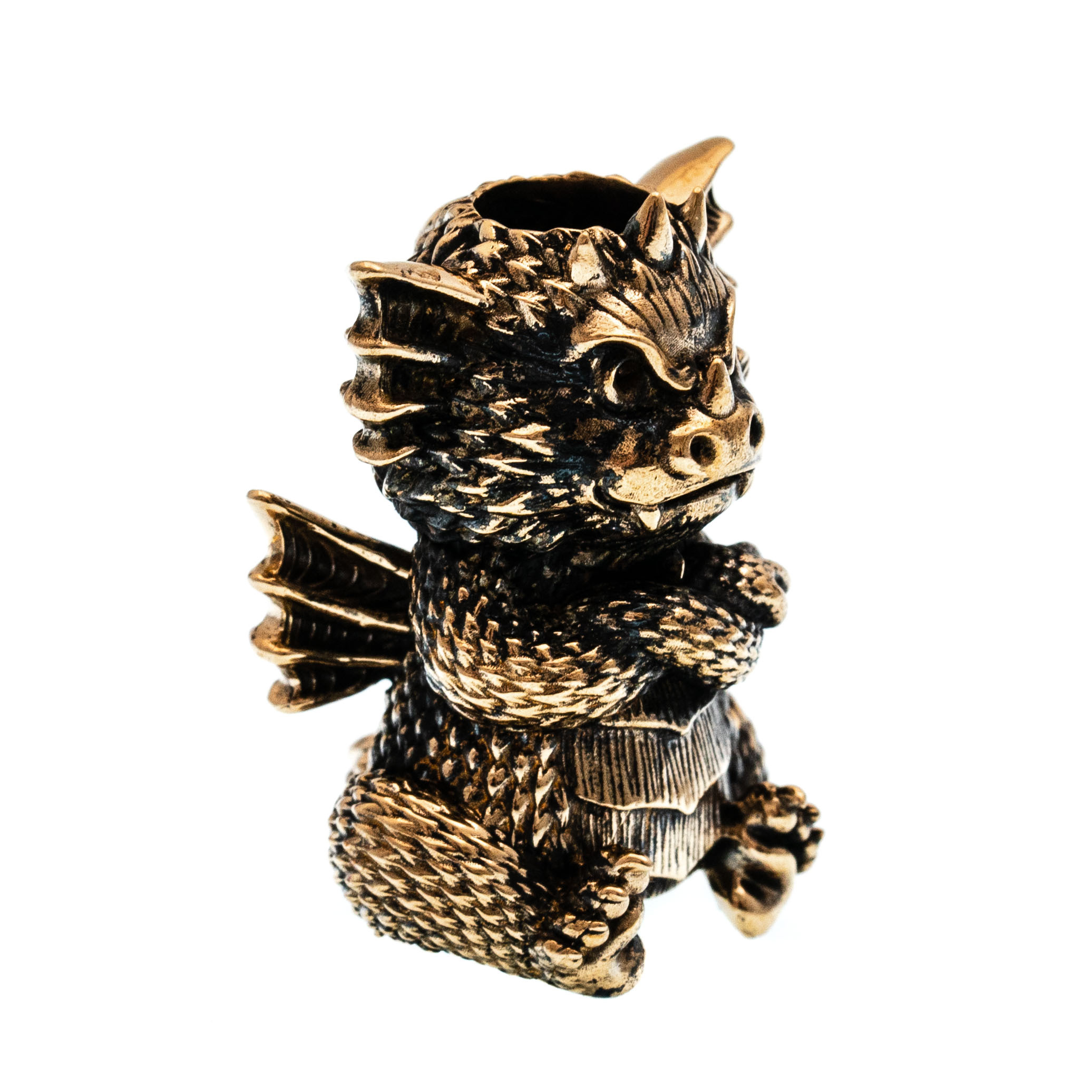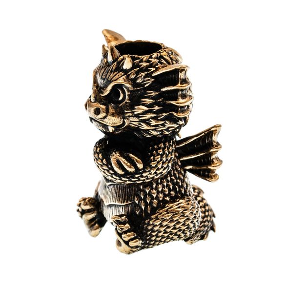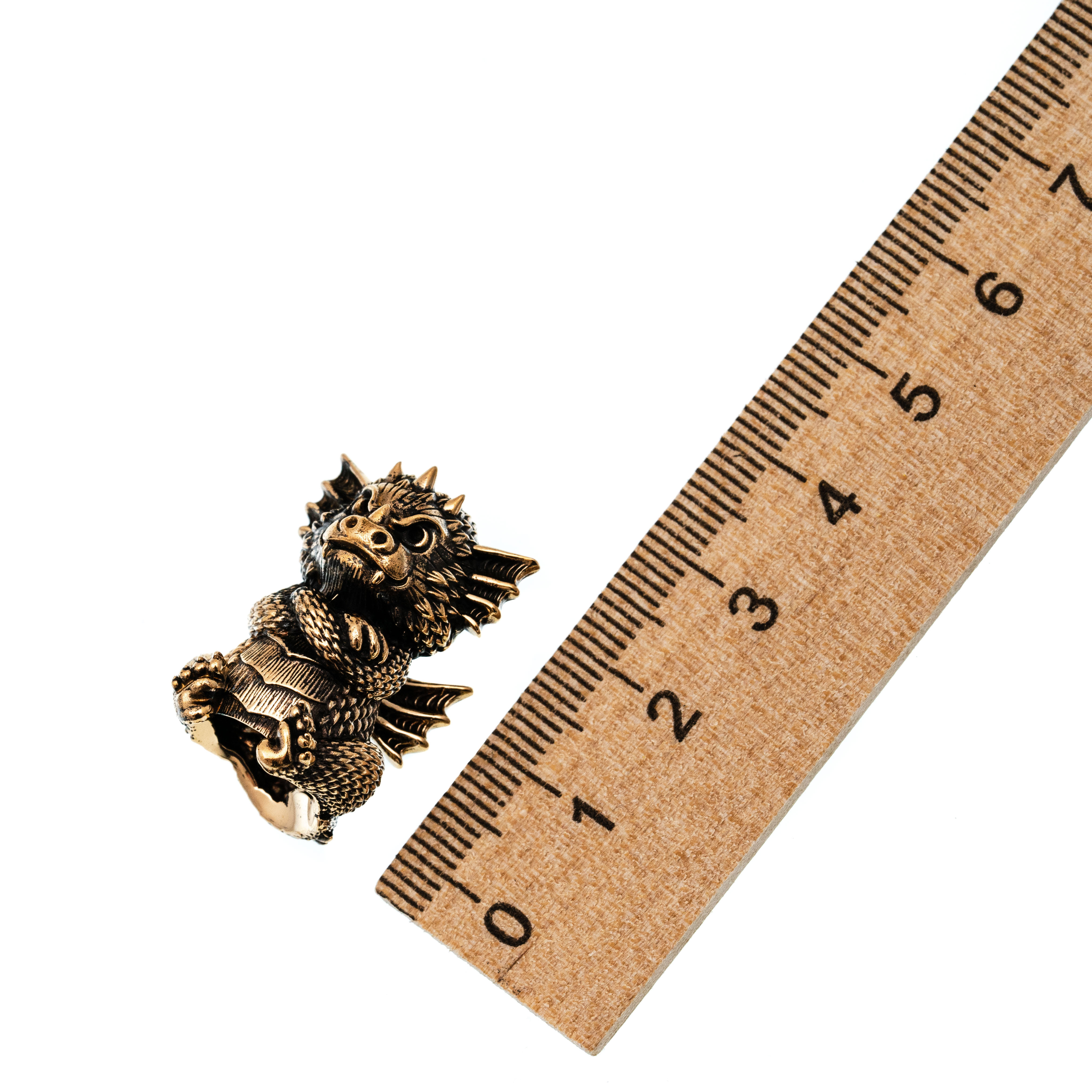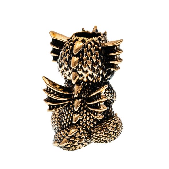 Бусина выполнена из бронзы с высокой степенью детализации: чешуя, мордочка, лапы и складки тела проработаны буквально до миллиметра. Манера изображения дракона отсылает к японской культуре - по характеру линий и пластике формы, а его поза и выражение морды ближе к героям мультфильмов СССР: немного обиженный, немного смешной и очень живой. Такое сочетание делает аксессуар коллекционной мелочью с явным ювелирным подходом к исполнению.