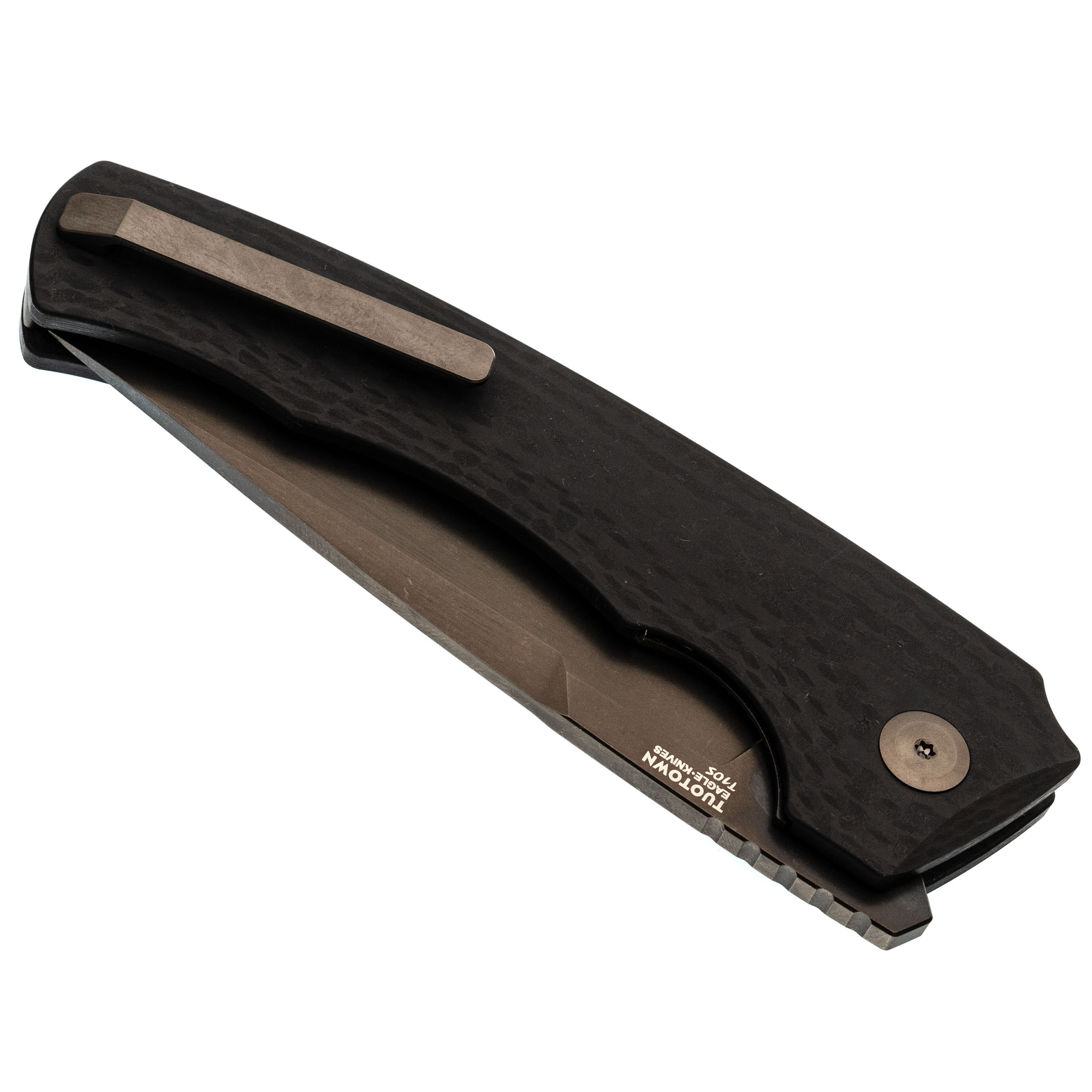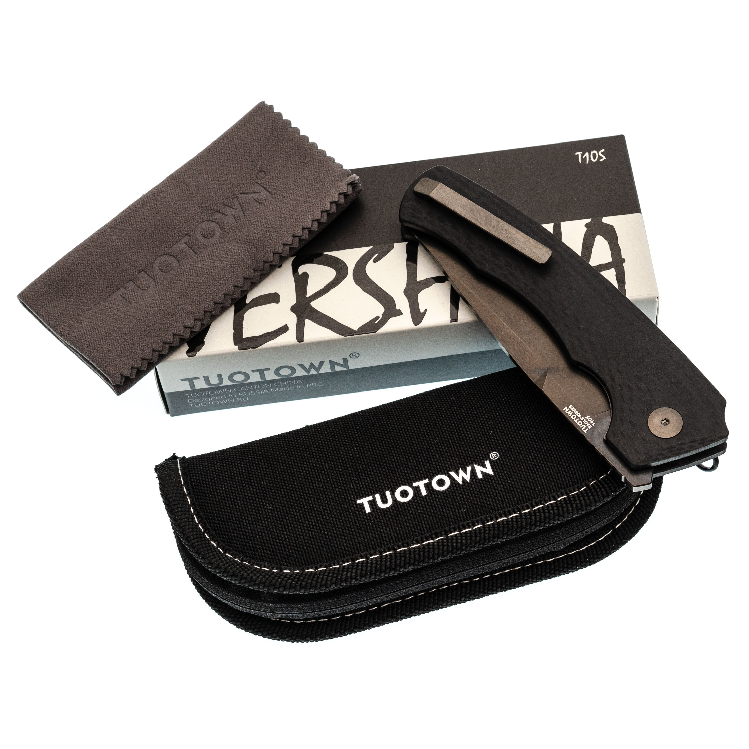 Megeb от мастерской TuoTown - средний по габаритам складной нож, который органично вписывается в повседневный набор. Он не тянет карман и не привлекает лишнего внимания, но в работе ведёт себя как серьёзный инструмент: упаковка, продукты, мелкий столярный ремонт, верёвка - весь привычный список ему по силам. Широкий Drop-Point, надёжный Liner-Lock и открывание через Front Flipper делают Megeb удобным спутником на каждый день.