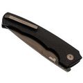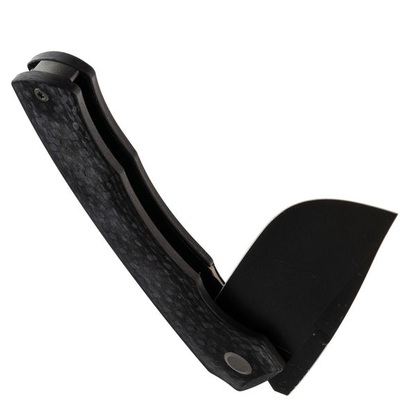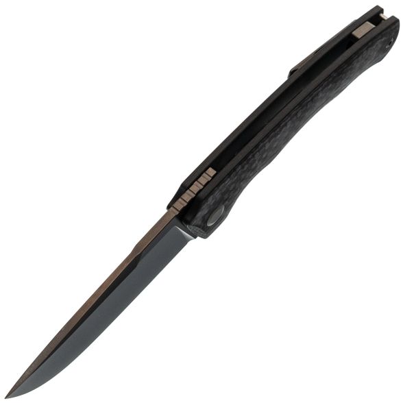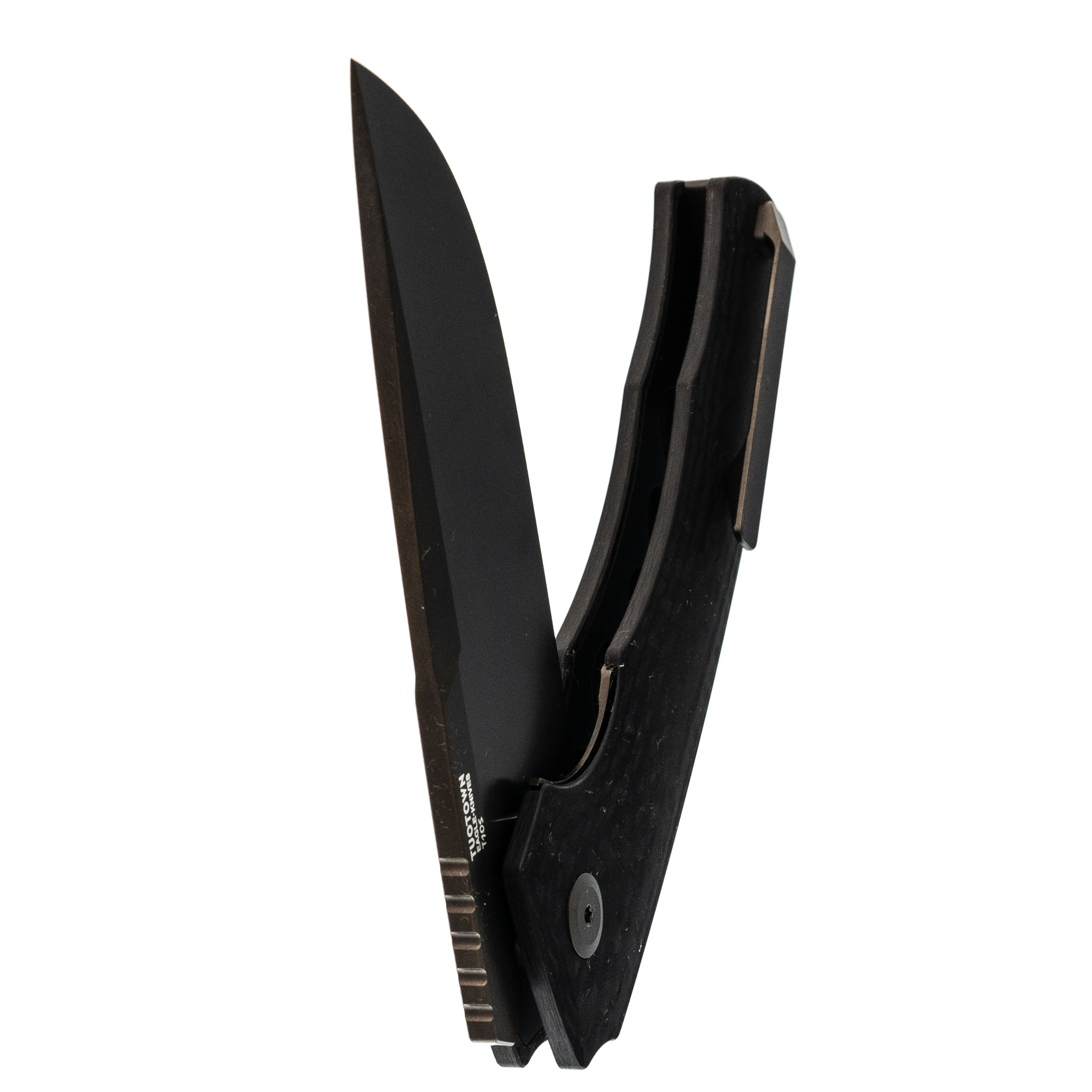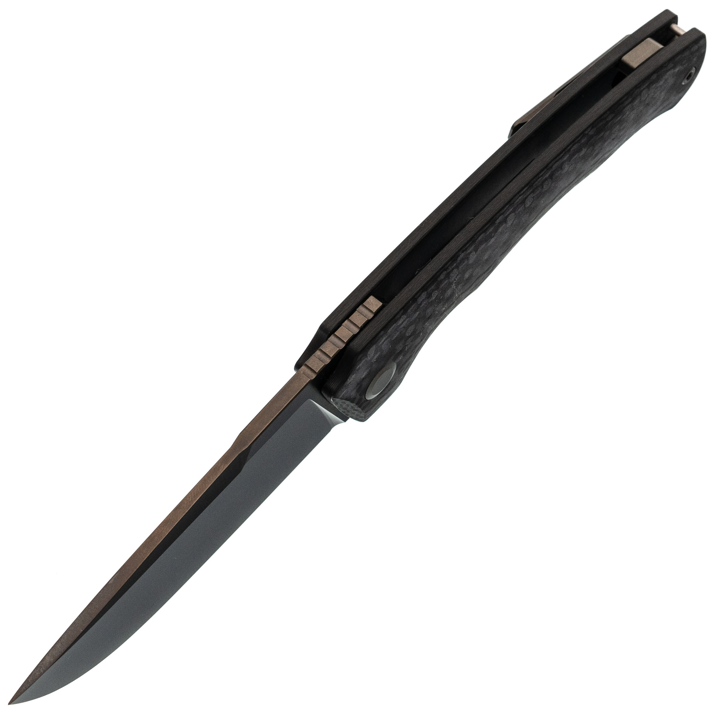 У Megeb широкий клинок с классическим профилем Drop-Point и прямыми спусками от обуха. Кончик сделан не слишком выраженным, за счёт чего изгиб режущей кромки получается более длинным и плавным - удобно вести клинок протяжным резом по картону, канату или продуктам. Такая геометрия даёт хороший контроль и при точной работе, и при уверенном строгании. Сталь T10S поддерживает этот характер: кромка не сдаётся после нескольких выездов и при разумном обращении требует только периодической правки. Открывание Front Flipper позволяет вывести клинок в рабочее положение лёгким движением большого пальца вдоль обуха - тихо, быстро и без лишних жестов.