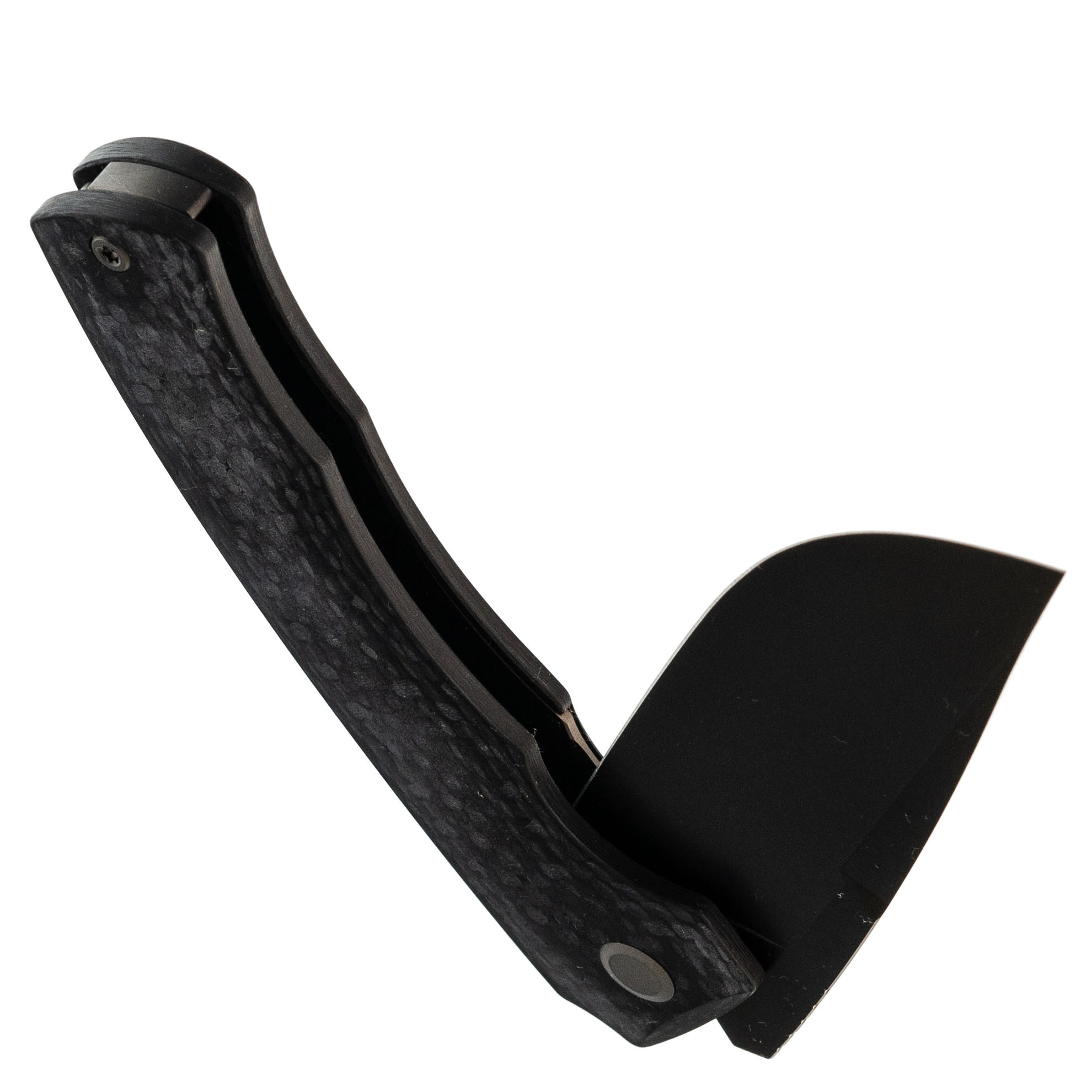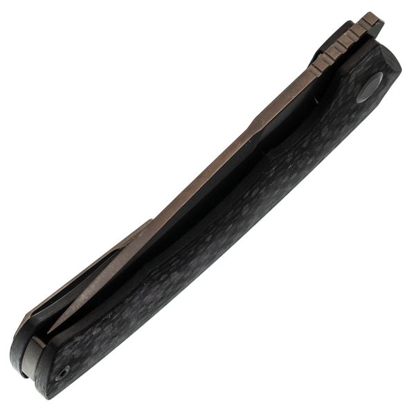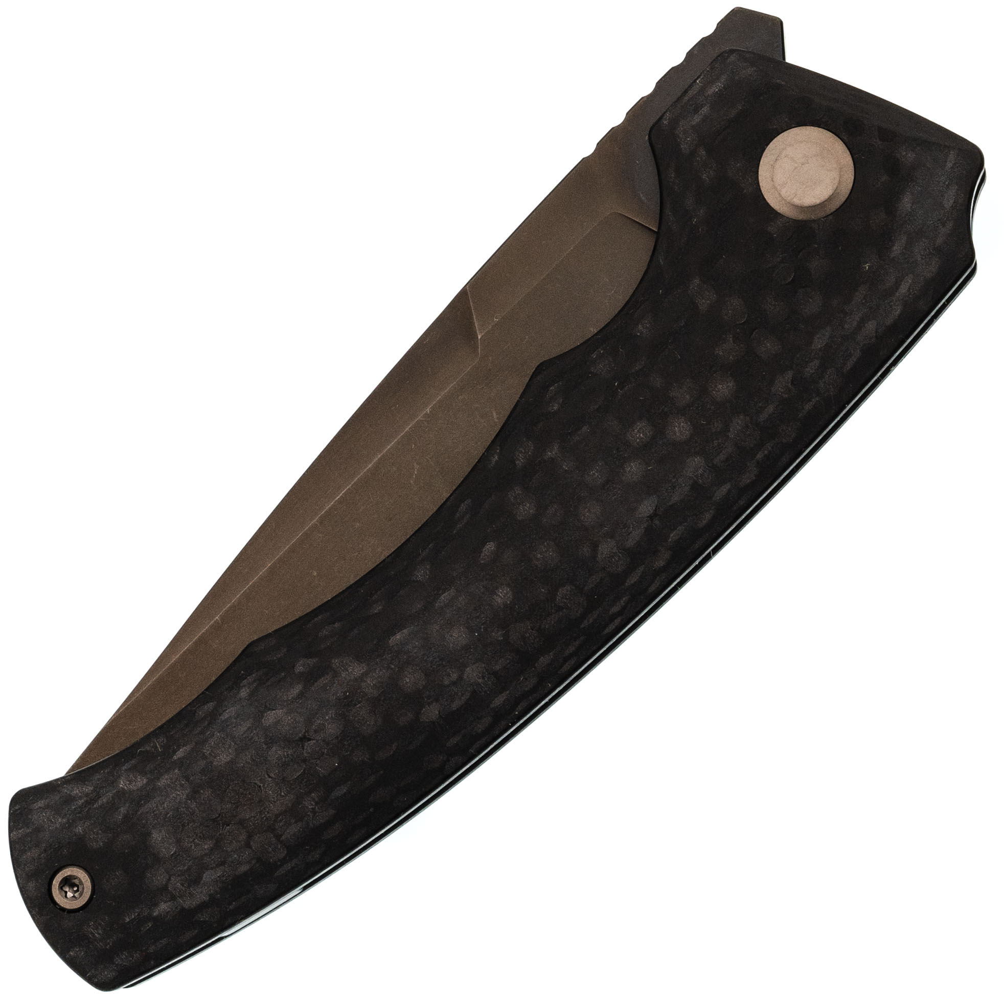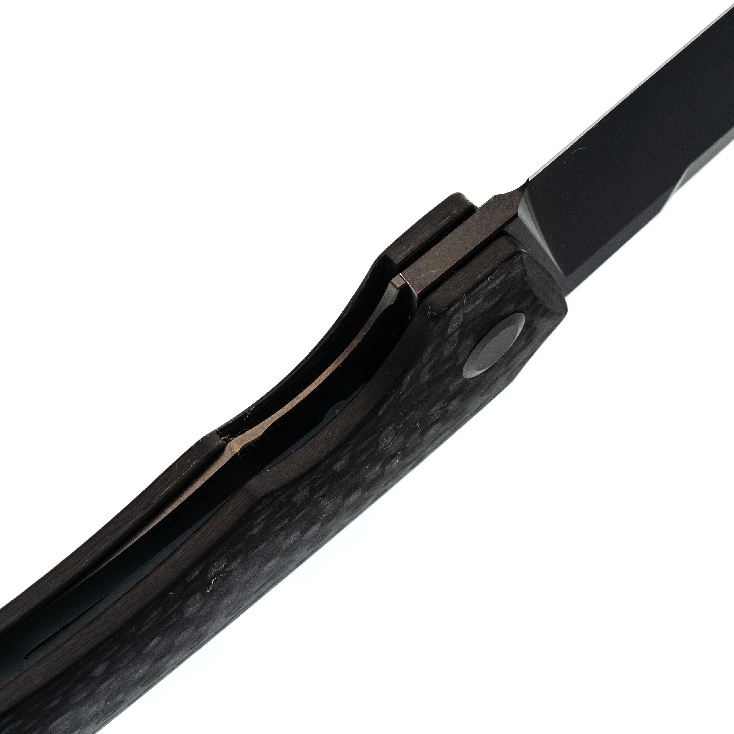 Торцевой G10 на рукояти. Прочный композит, устойчивый к ударам, перепадам температуры и влаге. Торцевая раскладка создаёт интересный рисунок, визуально напоминающий карбон, и даёт цепкую поверхность для уверенного хвата.