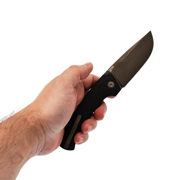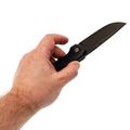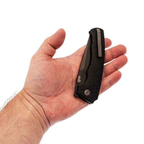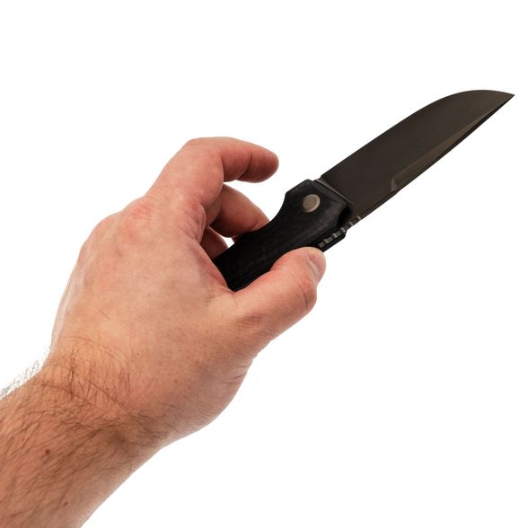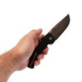 Рукоять Megeb рассчитана на среднюю и крупную ладонь: нож ощущается компактным в кармане и уверенным в хвате. Эргономичная форма с подпальцевым упором не даёт руке съезжать вперёд при силовом резе и помогает контролировать клинок при строгании. Торцевой G10 добавляет сцепления - рукоять не пытается провернуться даже в уставшей или слегка влажной руке. Грани аккуратно сглажены, так что при длительной работе пальцы не натираются, а нож не вызывает ощущения «кирпича» в руке.