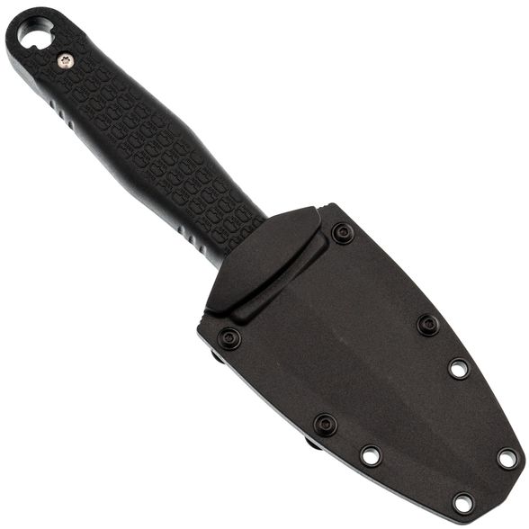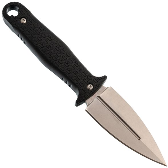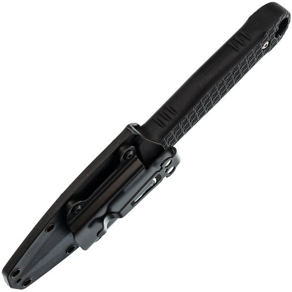 Рукоять выполнена из термопластика FRN, который гарантирует прочность и легкость конструкции, соответствуя универсальным требованиям. Нож оснащён всадным монтажом для достижения оптимального баланса, а съёмная конструкция упрощает обслуживание. Крупное темлячное отверстие с формой, напоминающей череп, типично для Daggerr.
