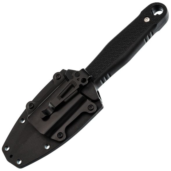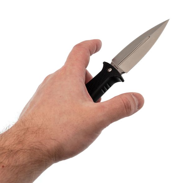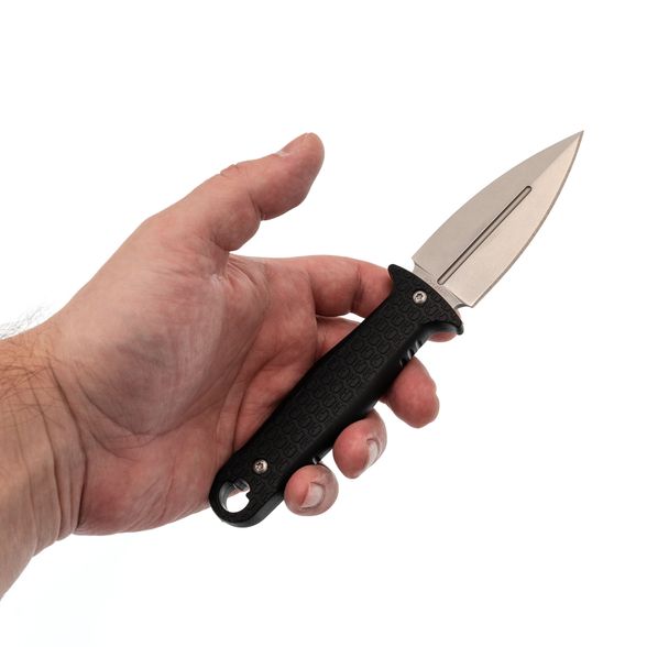 Клинок изготовлен из стали 8Cr14MoV – нержавеющей стали, обладающей высокой ударной вязкостью, устойчивостью к коррозии и простотой заточки. Его кинжальный профиль обеспечивает проникающие свойства, а деликатный кончик позволяет выполнять аккуратные надрезы. Обработка клинка Stonewash скрывает царапины от использования, а покрытие Black Stonewash повышает коррозионную стойкость и устраняет блики.