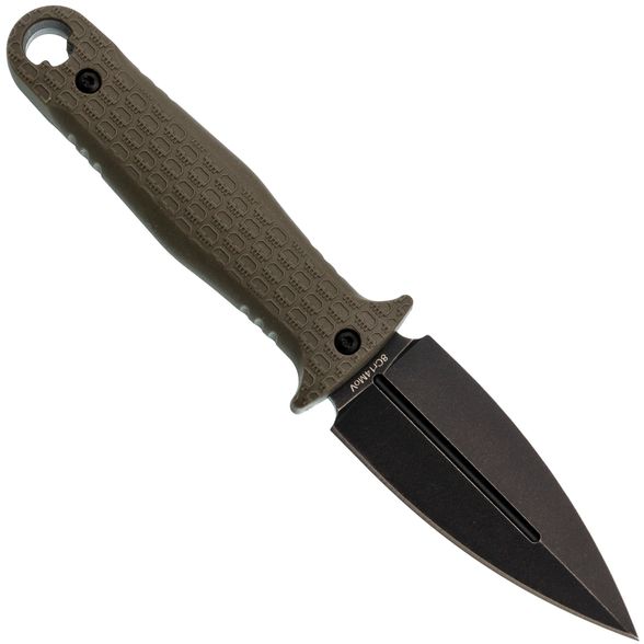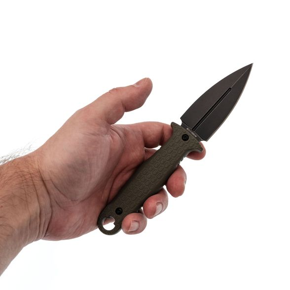Рукоять изготовлена из термопластика FRN, обладающего необходимой прочностью и легкостью для эксплуатации в любых условиях. Благодаря всадному монтажу нож демонстрирует баланс между надежностью и малым весом. Съёмная конструкция облегчает обслуживание, а крупное темлячное отверстие с формой, напоминающей череп, характерно для Daggerr.