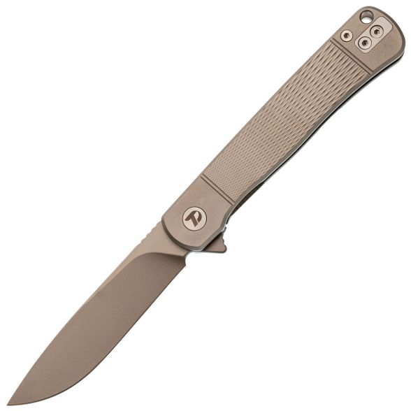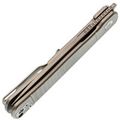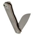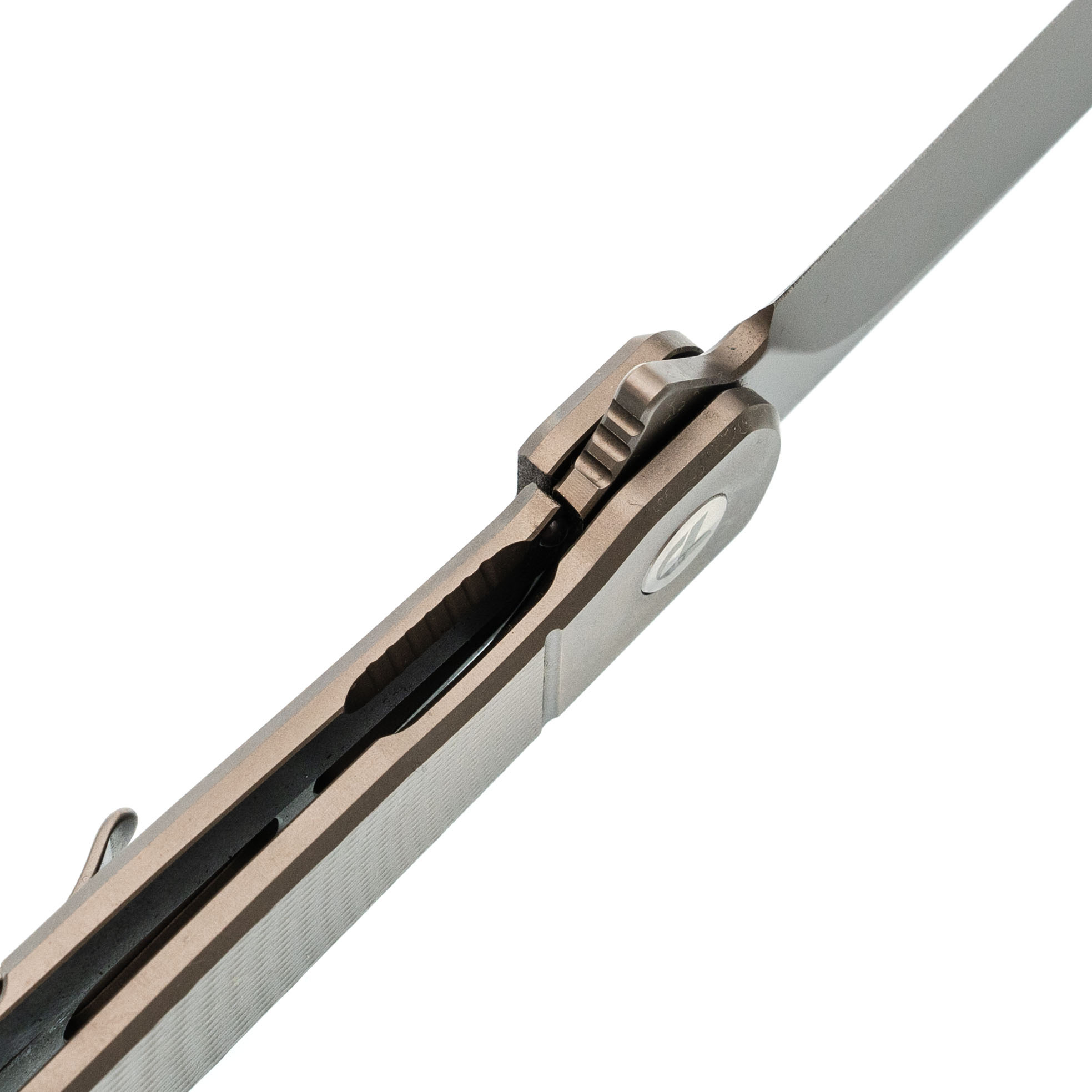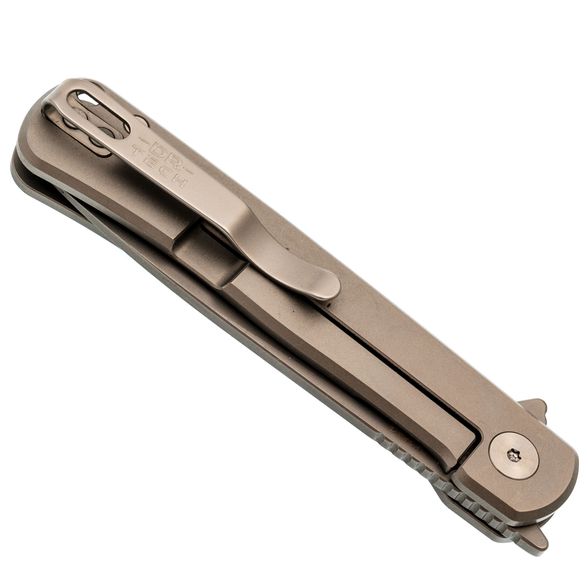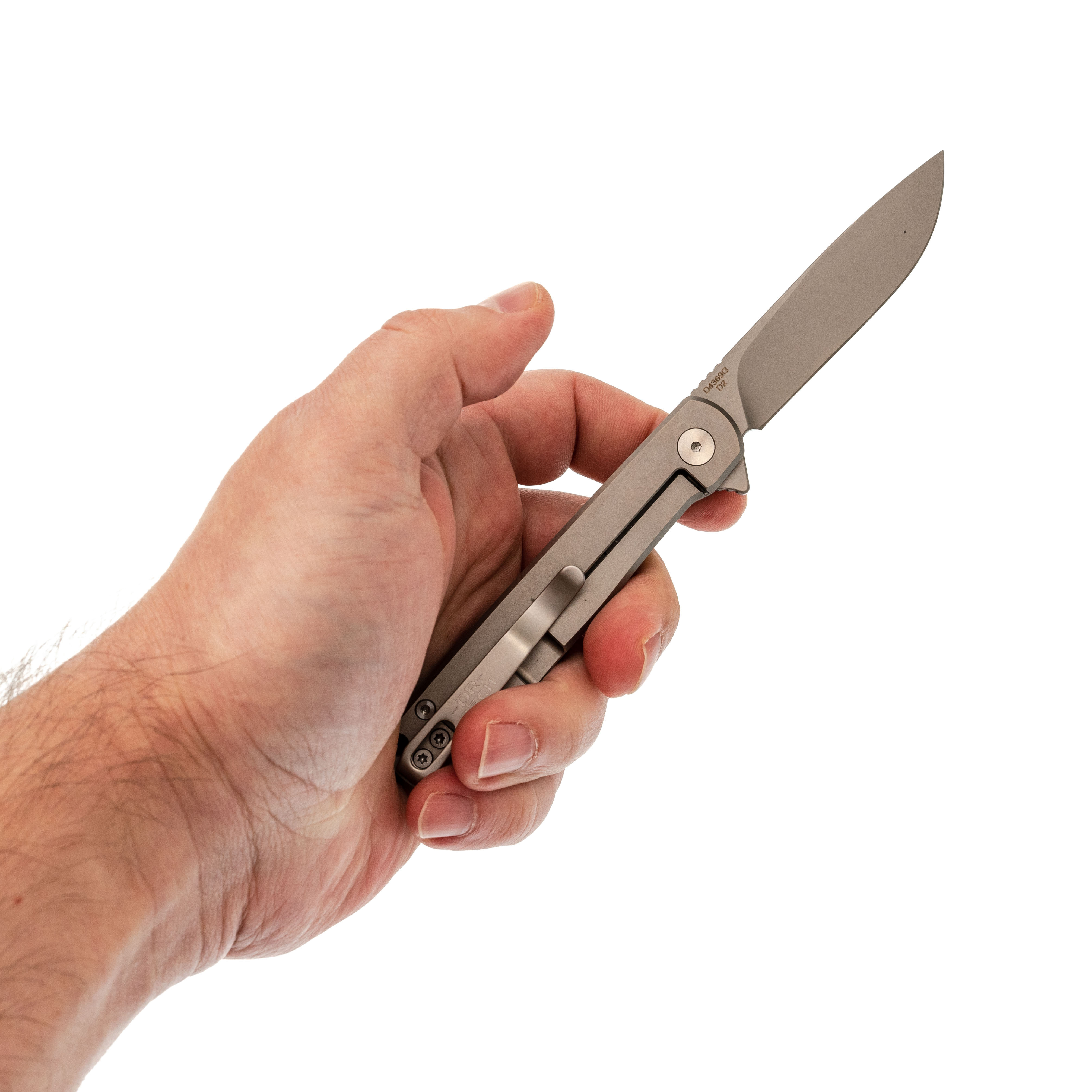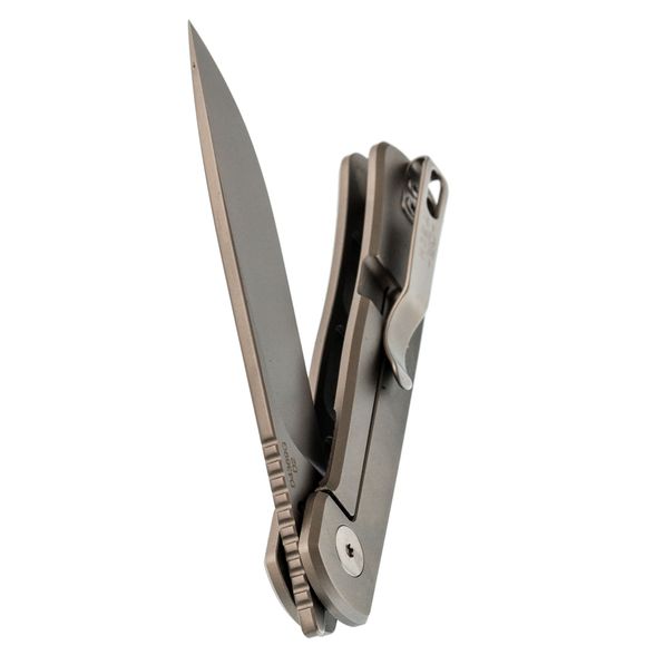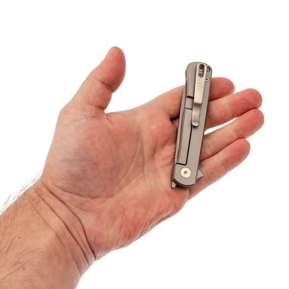 Рукоять здесь слегка изогнутая и остаётся нейтральной по форме, поэтому одинаково удобна в разных хватах. Серебристые титановые накладки TC4 с декоративной насечкой добавляют ножу аккуратный технологичный вид и улучшают сцепление с рукой. Внутри - стальные лайнеры, образующие с титаном надежную "сэндвичную" конструкцию. Переставляемая карманная клипса помогает настроить нож под привычный способ ношения, будь то карман джинсов или кромка городской сумки.