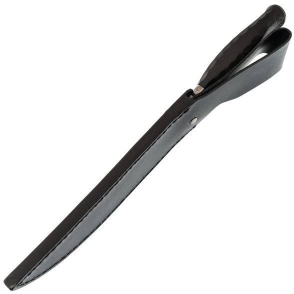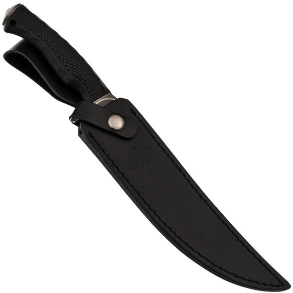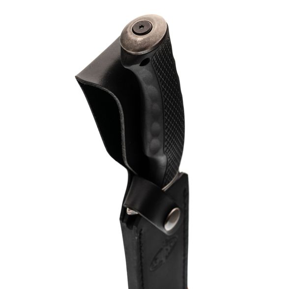 В комплекте идут кожаные ножны с жёстким подвесом для крепления на ремне. Для фиксации ножа предусмотрен хлястик с застёжкой, который исключает выпадение во время движения. Это делает транспортировку максимально удобной и безопасной.