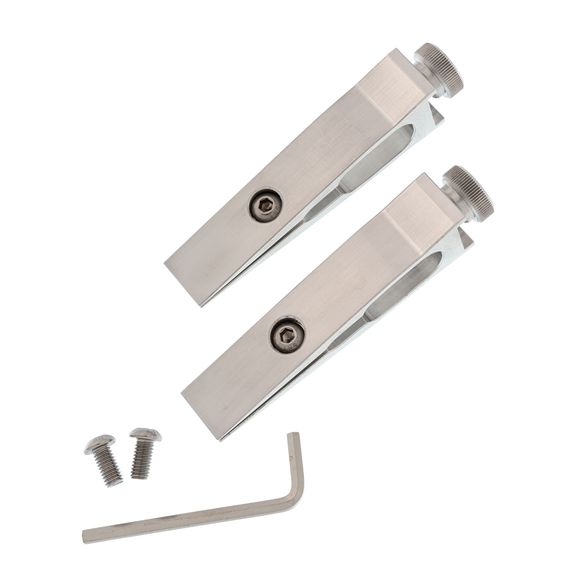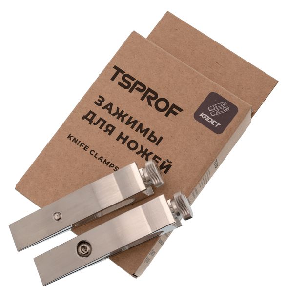 Зажимы изготовлены из цельного куска авиационного алюминия. Благодаря двум точкам захвата, прогиб лезвия исключен. Есть возможность независимого перемещения зажимов, по всей длине рамки. Отсутствует необходимость калибровки. С этими зажимами становится возможным заточка ножей со «скандинавскими спусками» по линии спусков. Подходят для кухонных и филейных ножей с узким обухом, ножей-брелков, опасных бритв, ножей со «сканди-спусками» и т.п.