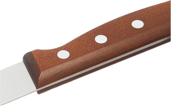 - Сталь X55CrMo14. Хорошая нержавеющая марка, которую любят за баланс. Она достаточно мягкая, чтобы нож можно было легко править мусатом после каждой готовки (что для филейника норма), но при этом держит заводскую заточку достойно. Хром в составе даёт защиту от коррозии, а молибден добавляет вязкости - именно поэтому тонкое лезвие гнётся под нагрузкой, а не лопается.