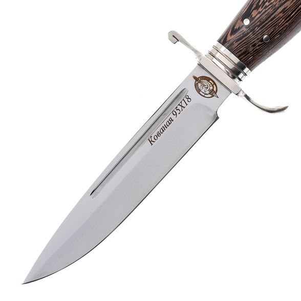 Клинок изготовлен из нержавеющей стали 95Х18, которая обеспечивает исключительную коррозионную стойкость и ударную вязкость. Универсальная форма Drop-Point делает нож универсальным. Спуски на 2/3 клинка делают его ломовитым, но благодаря не толстому обуху нож будет резать.