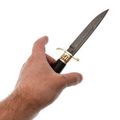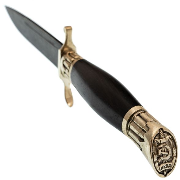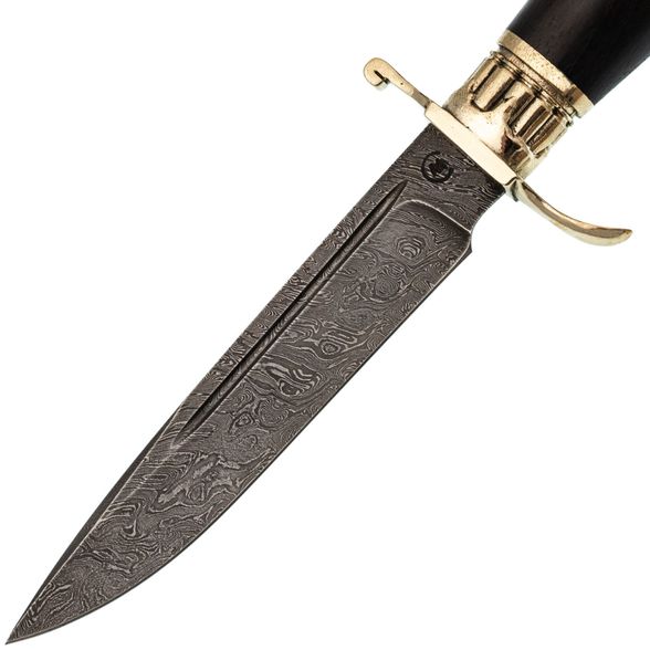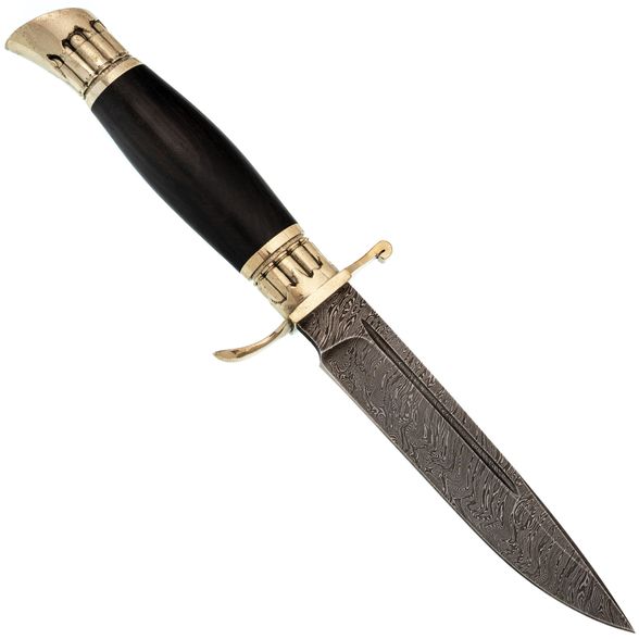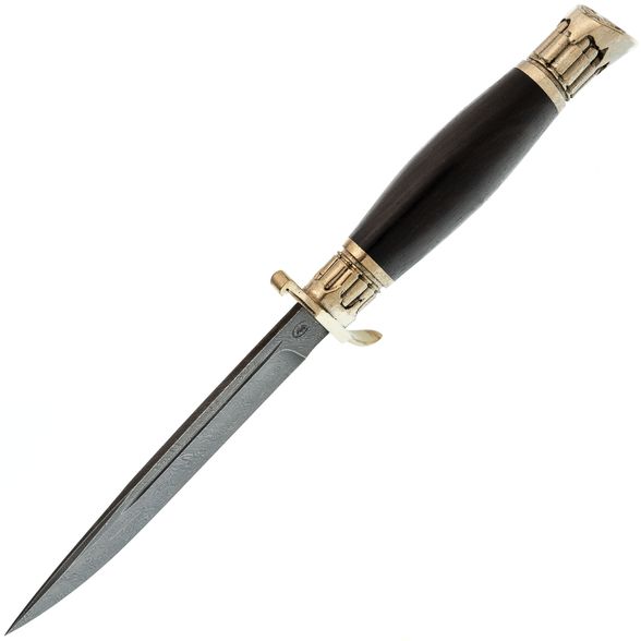 Клинок "Финки НКВД Патрон" изготовлен из дамасской стали, которая обладает неповторимым внешним видом. Хотя дамасская сталь и не является самой производительной, она точно самая уникальная - с таким клинком ваш нож ни с чем не спутать. В работе дамасская сталь показывает себя как добротная нержавеющая сталь: легко точится и имеет высокую ударную вязкость. Спуски на 2/3 клинка обеспечивают ножу достаточную прочность, а тонкий позволяет удовлетворительно справляться с резом продуктов.