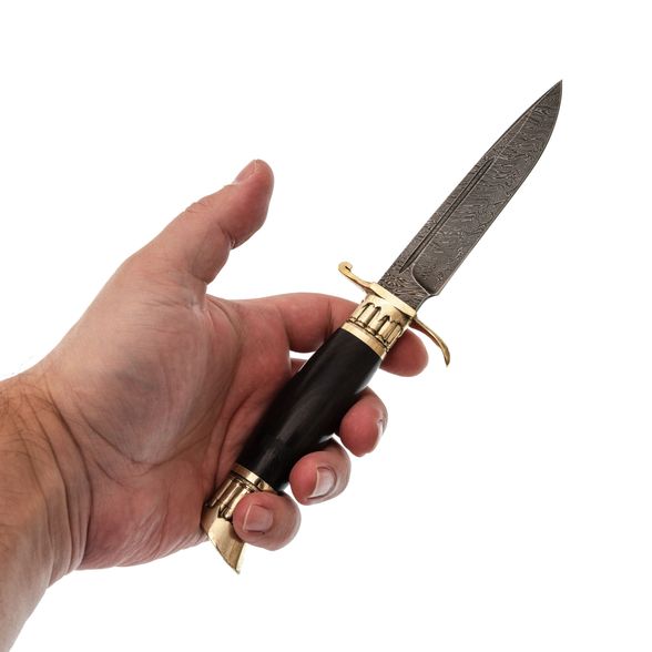 Рукоять ножа выполнена из граба и имеет традиционную бочковитую форму, которая комфортно лежит в руке. Развитая гарда обеспечивает безопасность и предотвращает соскальзывание руки на режущую кромку.