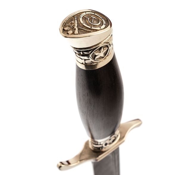 Рукоять выполнена из мельхиоровой гарды и навершия и так же прочной древесины граба. Развитая гарда гарантирует безопасность при работе с ножом - рука точно не соскользнёт на режущую кромку. Бочковитая форма хорошо заполняет руку что позволяет долго работать ножом без дискомфорта.