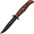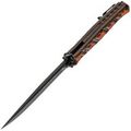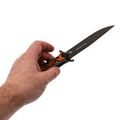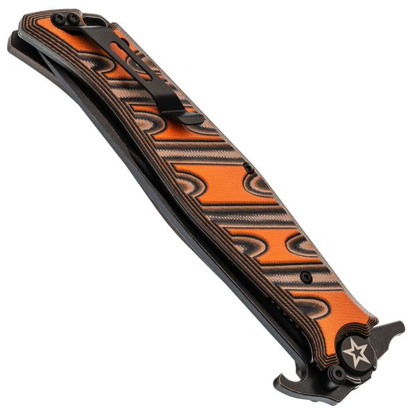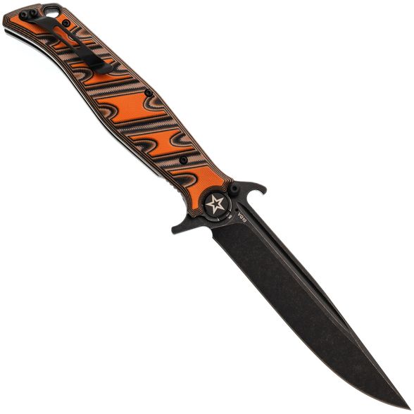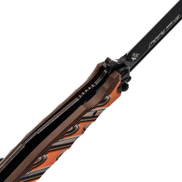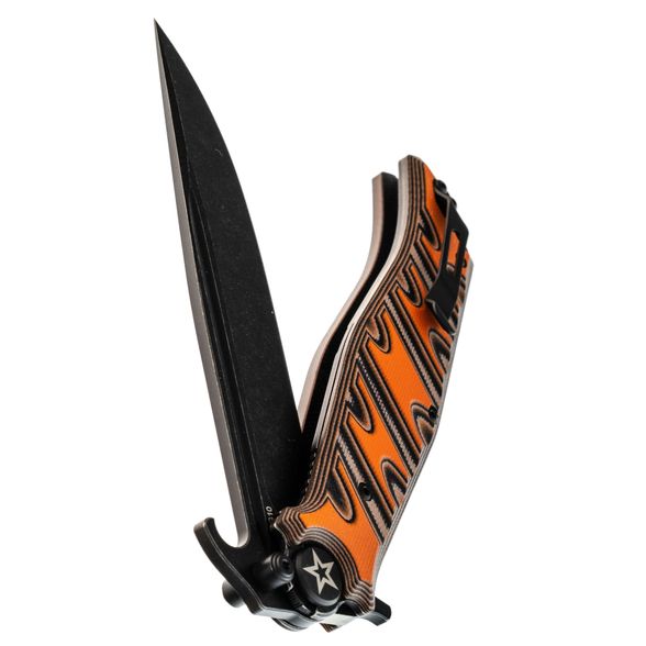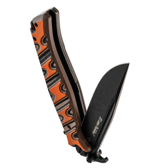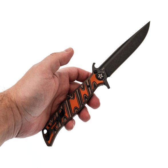 Клинок выполнен из стали VG-10 — это нержавеющая сталь высокого класса, известная своей износостойкостью, долговременным сохранением остроты и устойчивостью к коррозии. Профиль клинка Clip-Point обеспечивает высокую проникающую способность, а за счёт высоких прямых спусков нож плавно и легко режет. Покрытие Black Stonewash снижает блики и дополнительно защищает сталь от коррозии. Развитые упоры на клинке выполняют двойную функцию: они защищают руку при работе и позволяют открывать нож с помощью плавника (Flipper) или зацепом об край кармана по типу Wave.