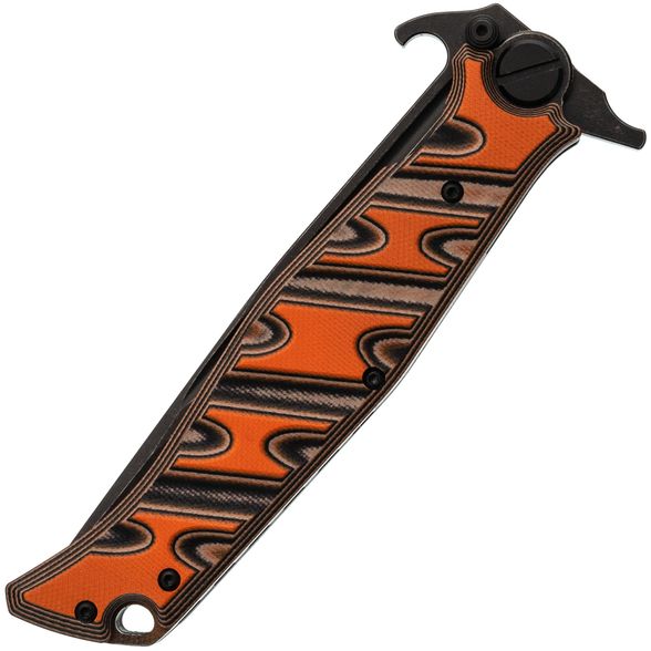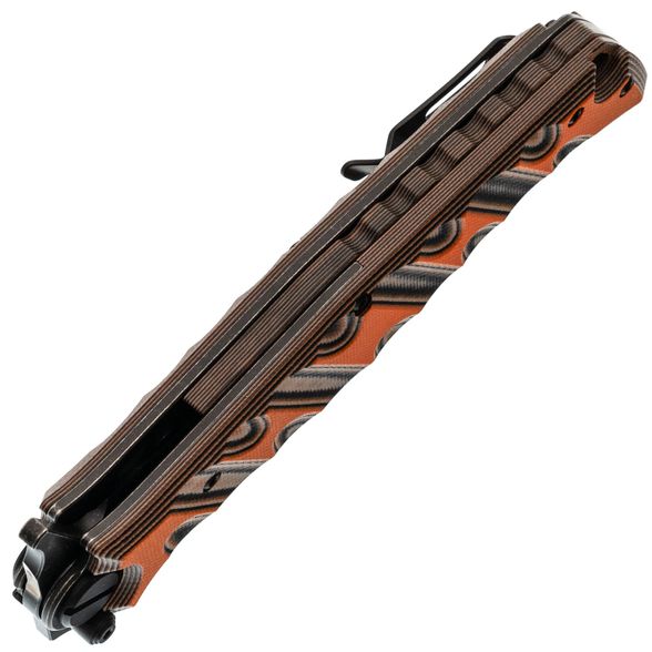 Рукоять выполнена из многослойного стеклотекстолита G10, устойчивого к влаге и нагрузкам. Этот материал лёгкий, прочный и неприхотливый в использоваи\нии. Рукоять имеет эргономичную форму, обеспечивающую надёжное удержание ножа в любых условиях. Для фиксации клинка в рабочем положении используется замок Liner-Lock, дополненный предохранителем для повышения безопасности при эксплуатации. Нож также оснащён карманной клипсой для удобного ношения и темлячным отверстием для крепления шнура или страховки.