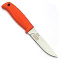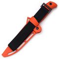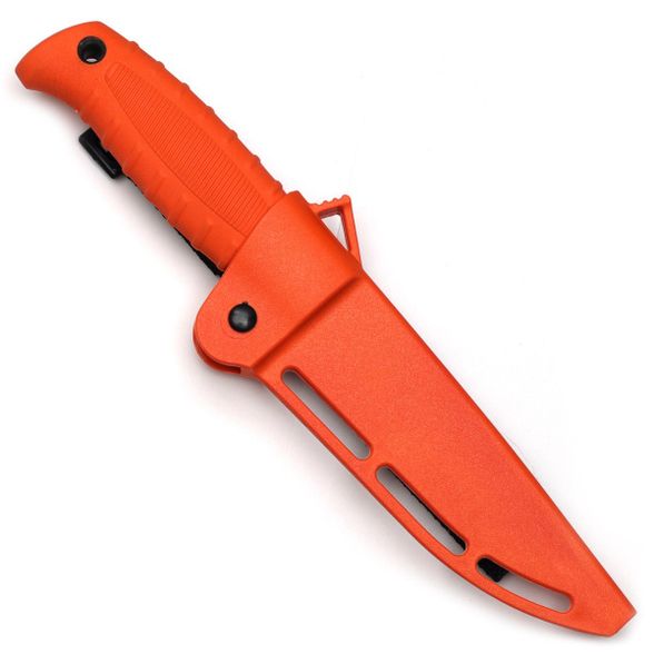 Компактные пластиковые ножны плотно фиксируют нож, исключая случайное выпадение. Материал не впитывает влагу, устойчив к морозу и механическим повреждениям. Яркий оранжевый цвет как ножа, так и ножен делает их легко заметными в траве, на земле или в снегу.