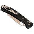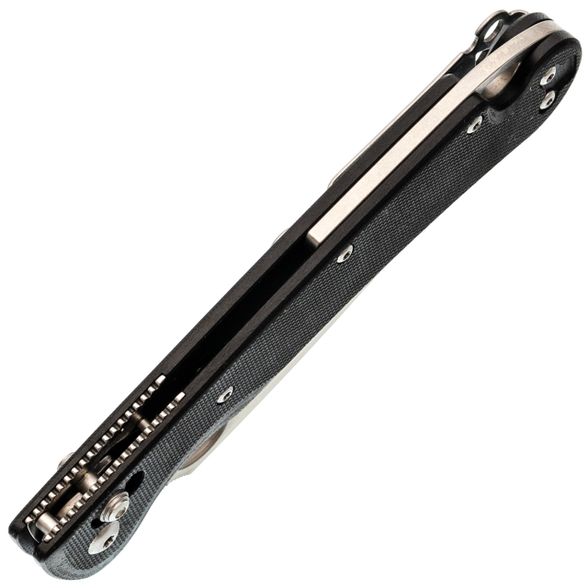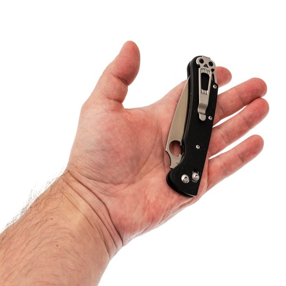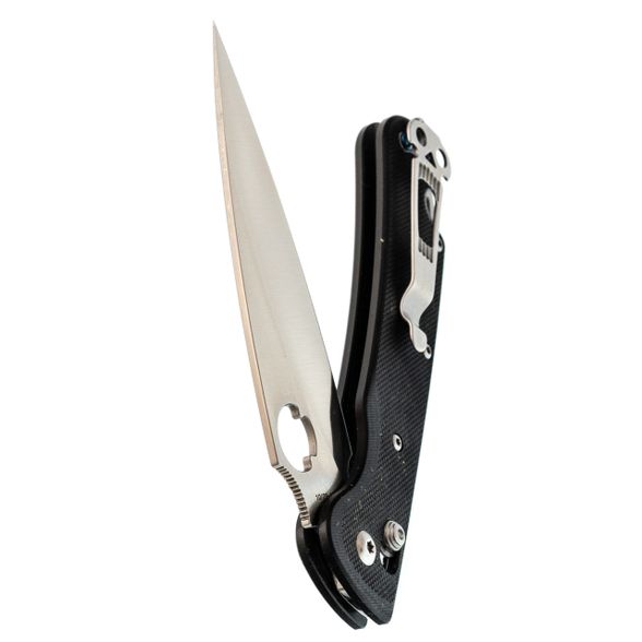 Рукоять изогнутой формы хорошо ложится в ладонь, подпальцевая выемка помогает контролировать нож при силовой работе. В бекспейсере предусмотрено темлячное отверстие. Фирменная клипса с черепом обеспечивает надёжное ношение в кармане.