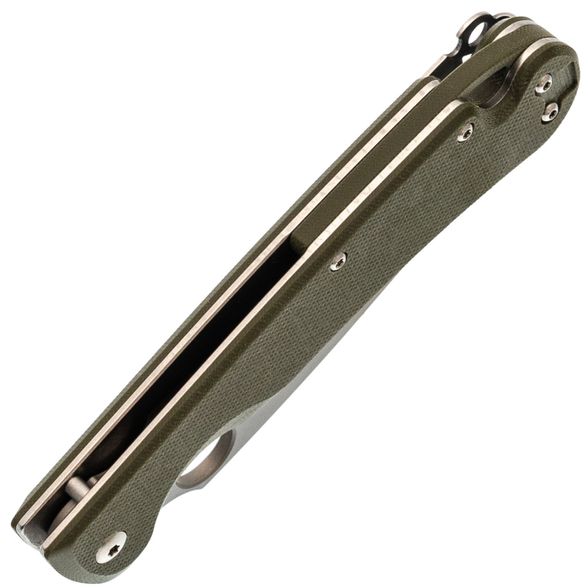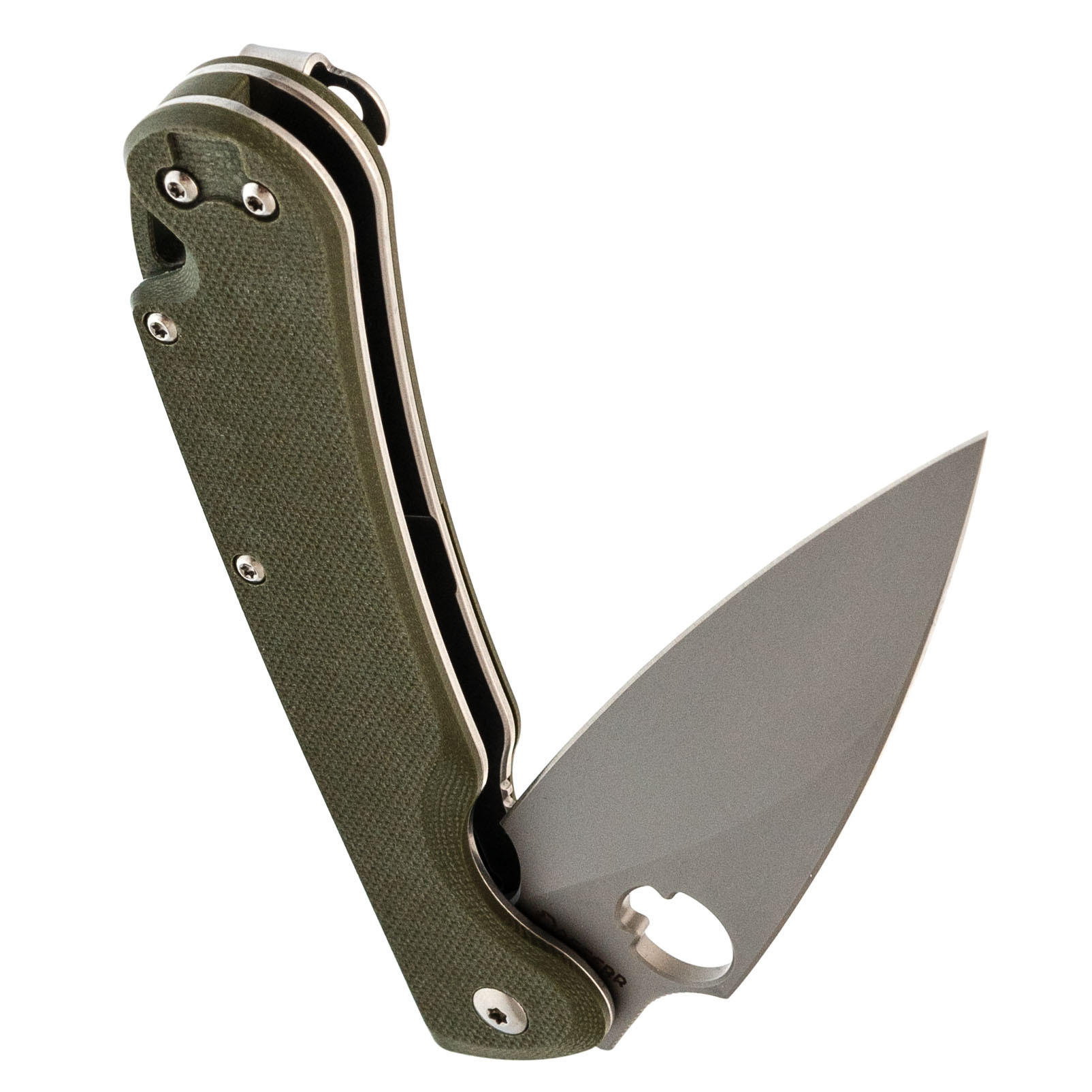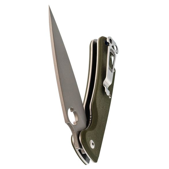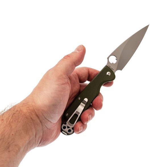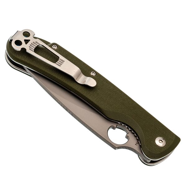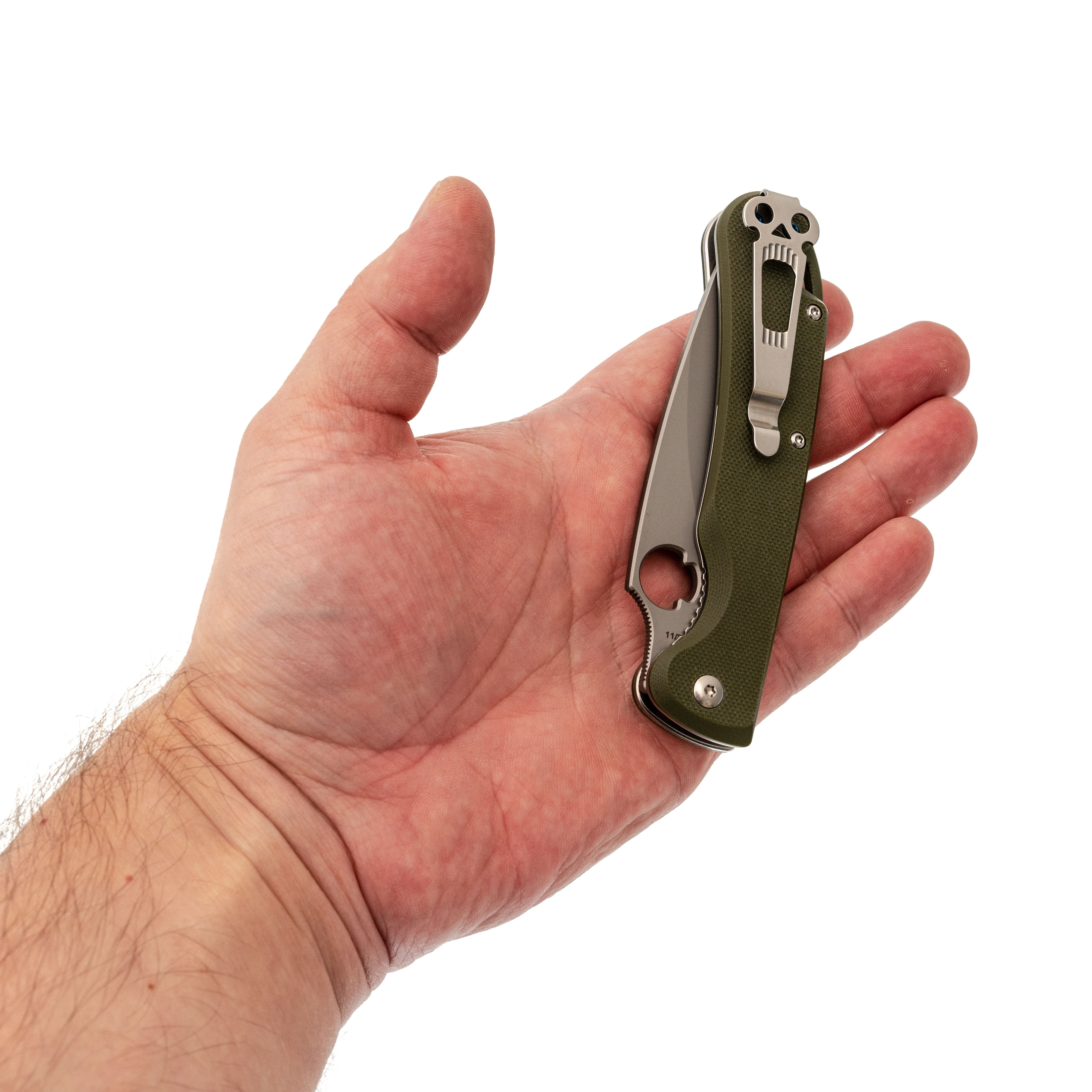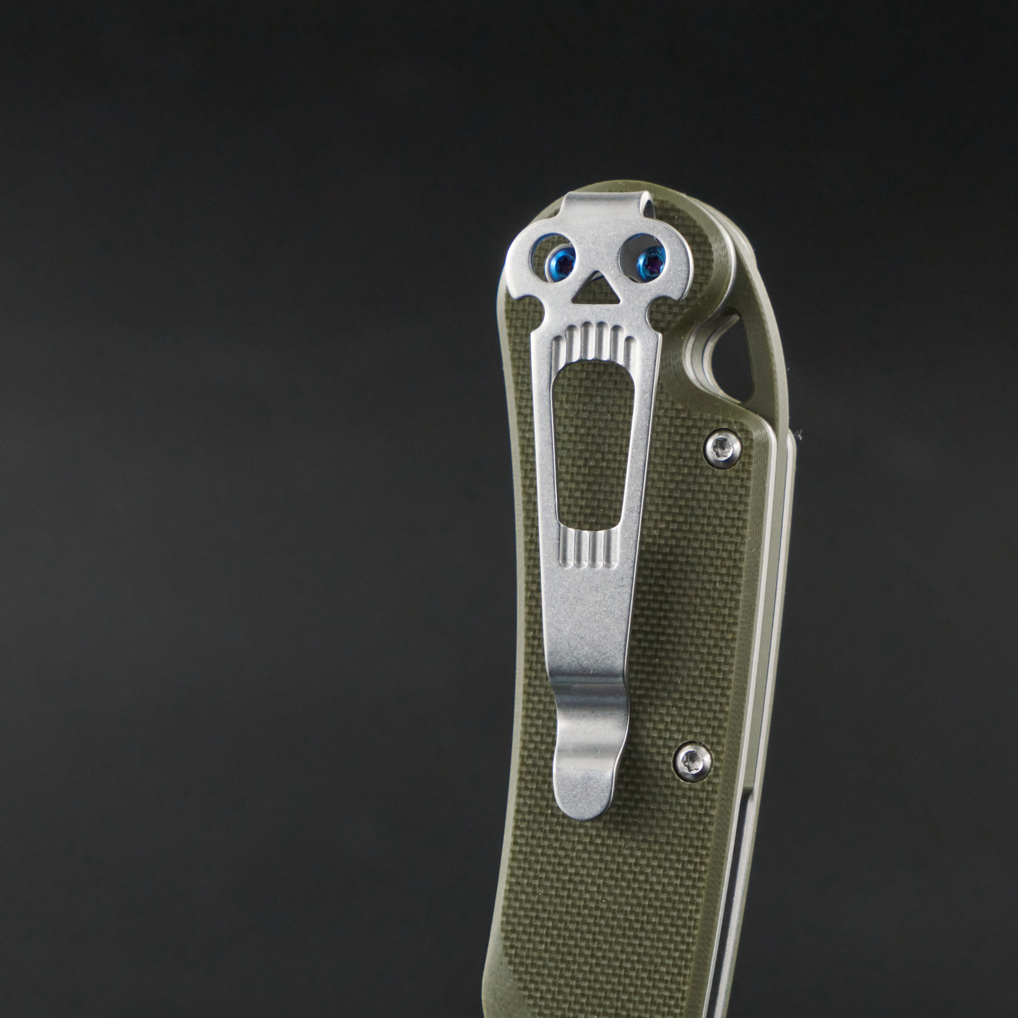 Оливковая G10 придаёт модели спокойный, тактический вид. Форма рукояти продумана под естественный хват - удобно и надёжно, без лишних граней. Текстура цепко удерживает ладонь, а крупный подпальцевый упор добавляет уверенности. Завершает образ стильная клипса в форме черепа и отверстие под темляк для удобного ношения.