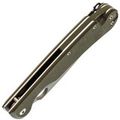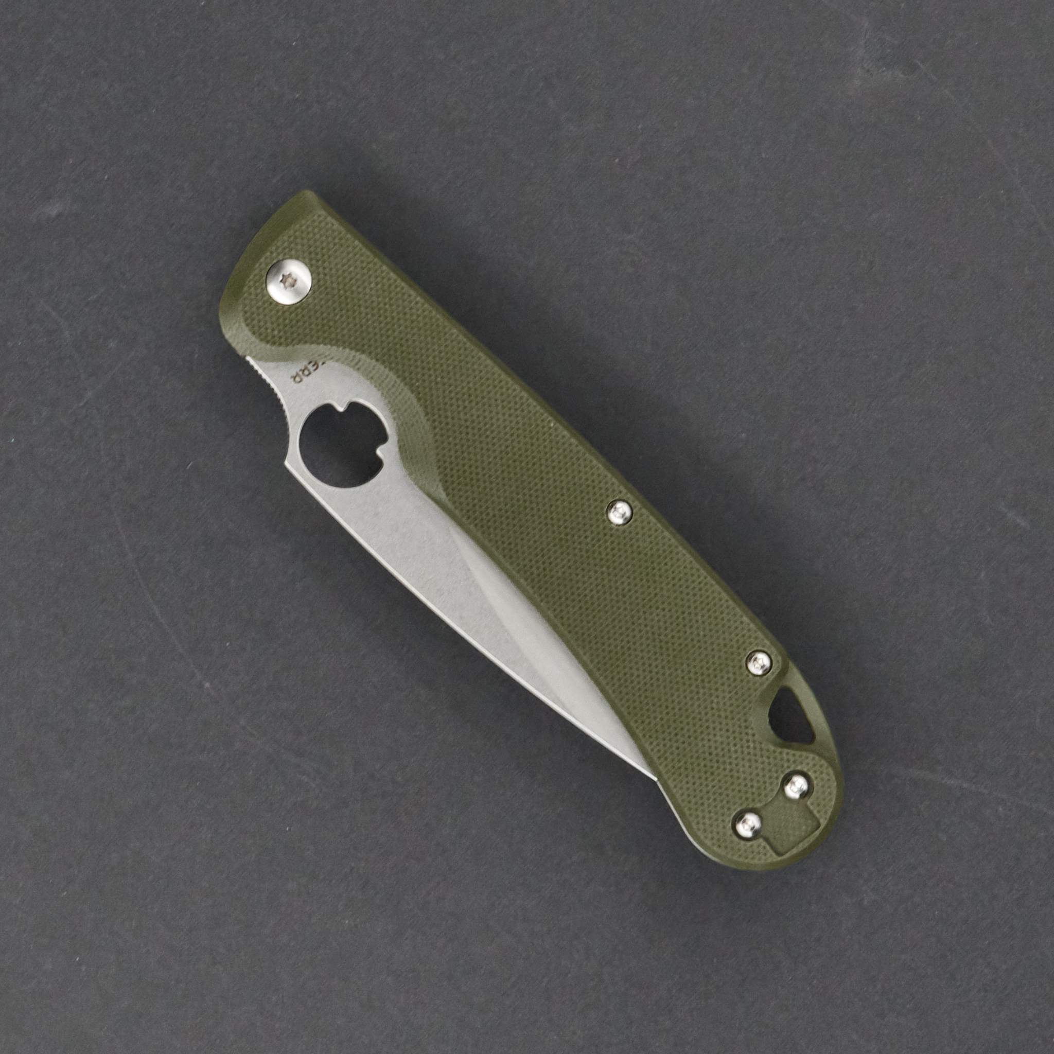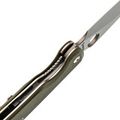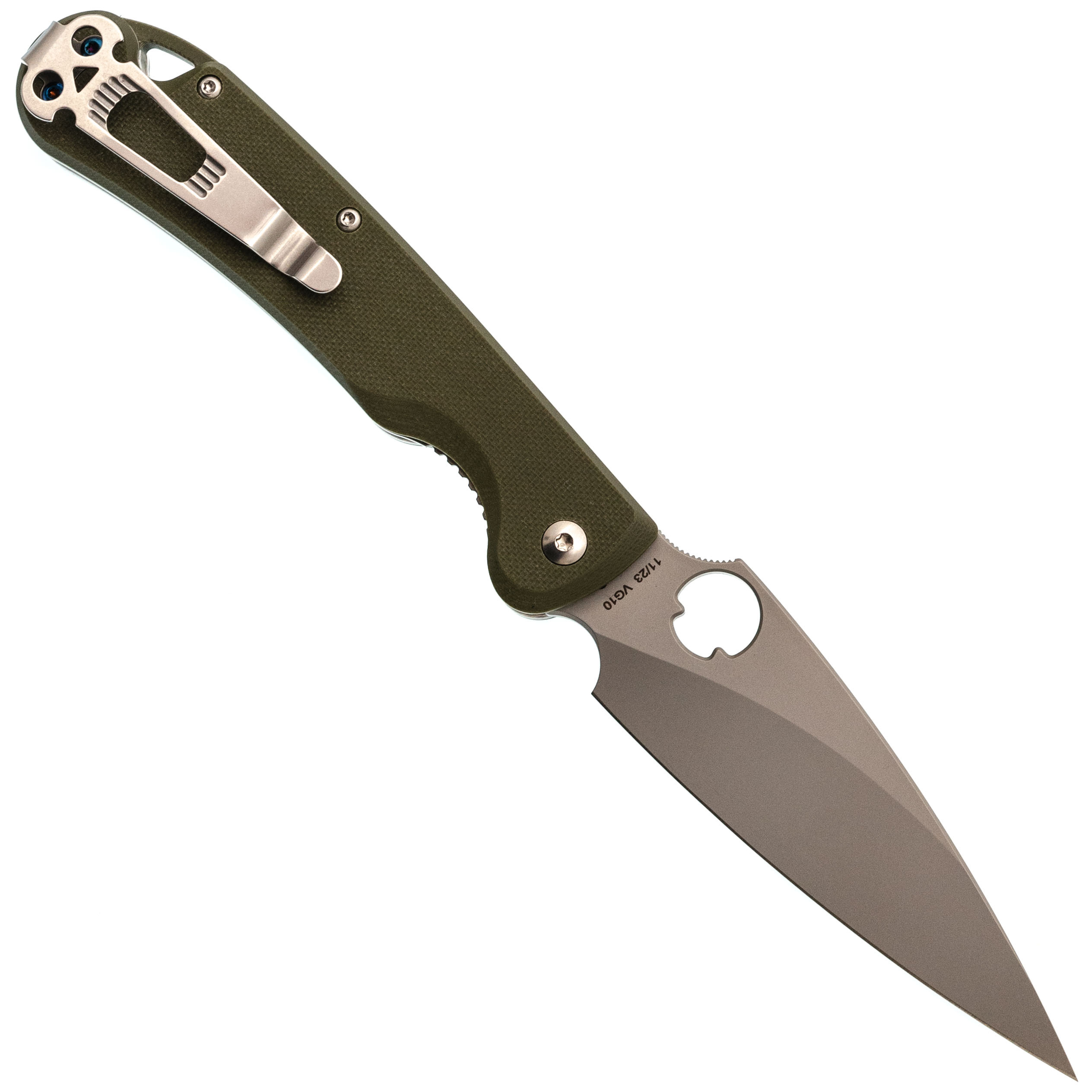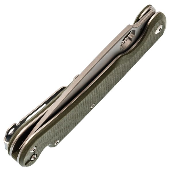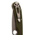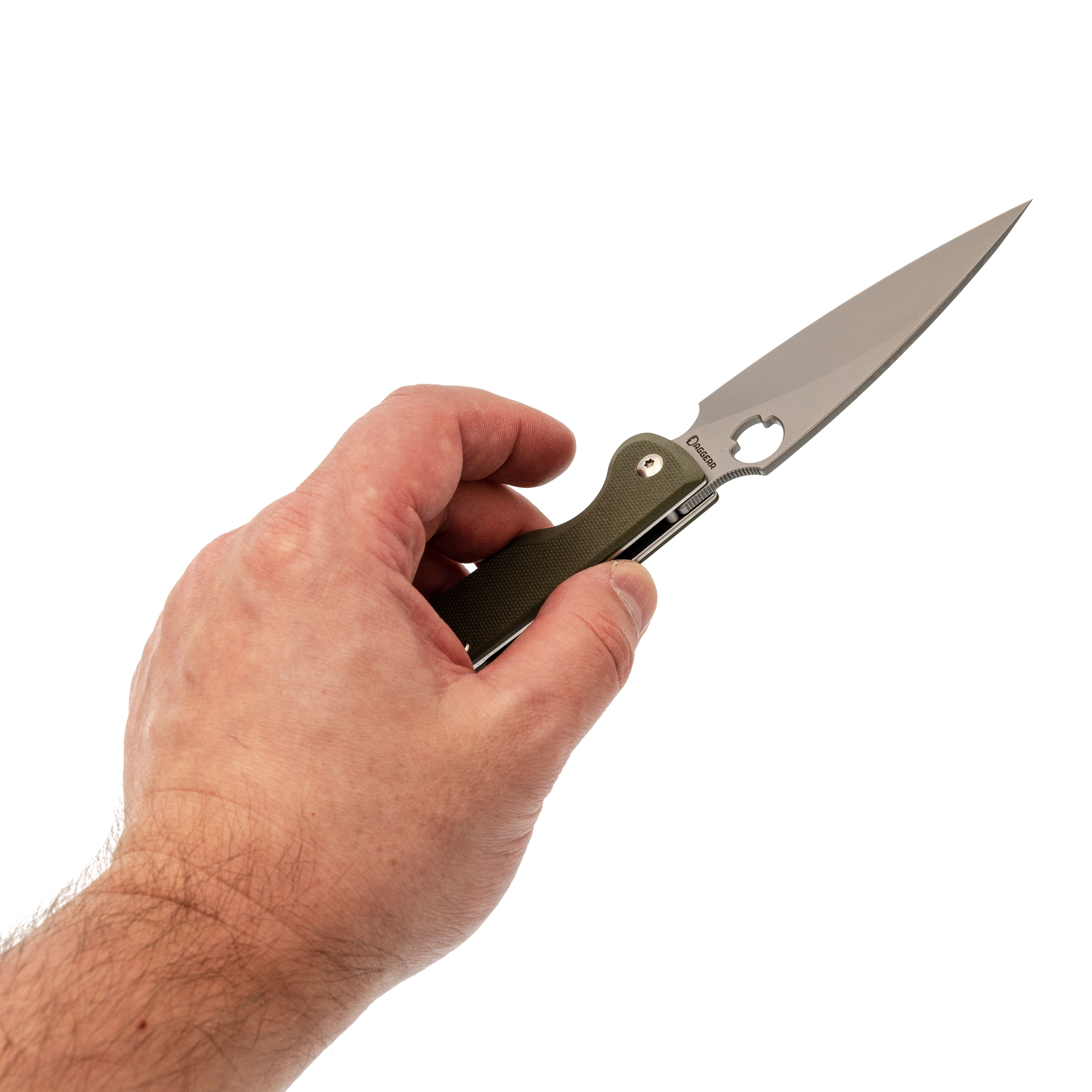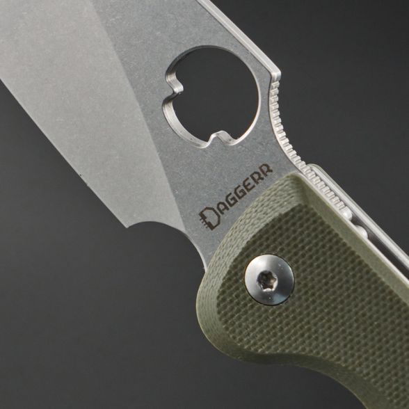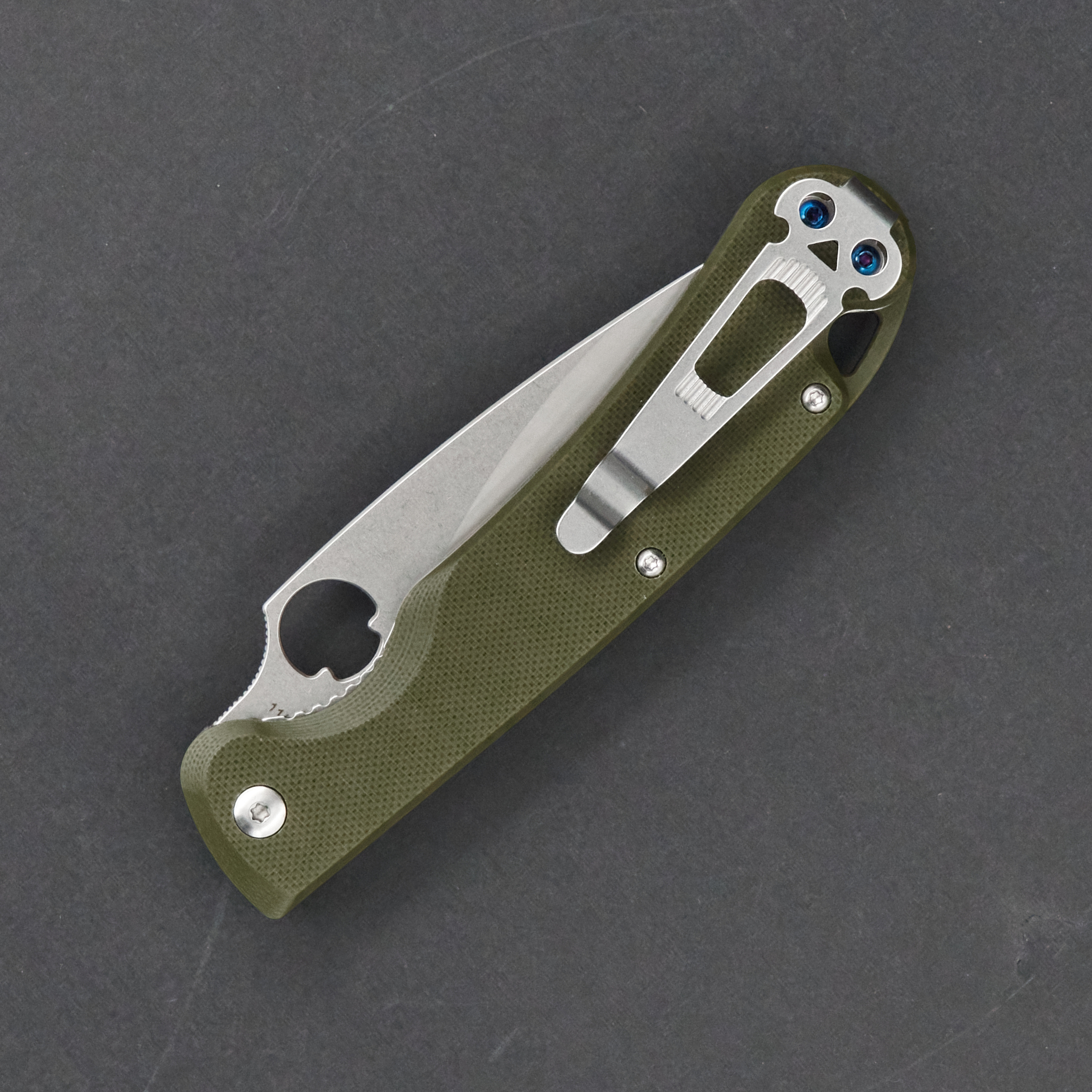 Оливковая G10 придаёт модели спокойный, тактический вид. Форма рукояти продумана под естественный хват - удобно и надёжно, без лишних граней. Текстура цепко удерживает ладонь, а крупный подпальцевый упор добавляет уверенности. Завершает образ стильная клипса в форме черепа и отверстие под темляк для удобного ношения.