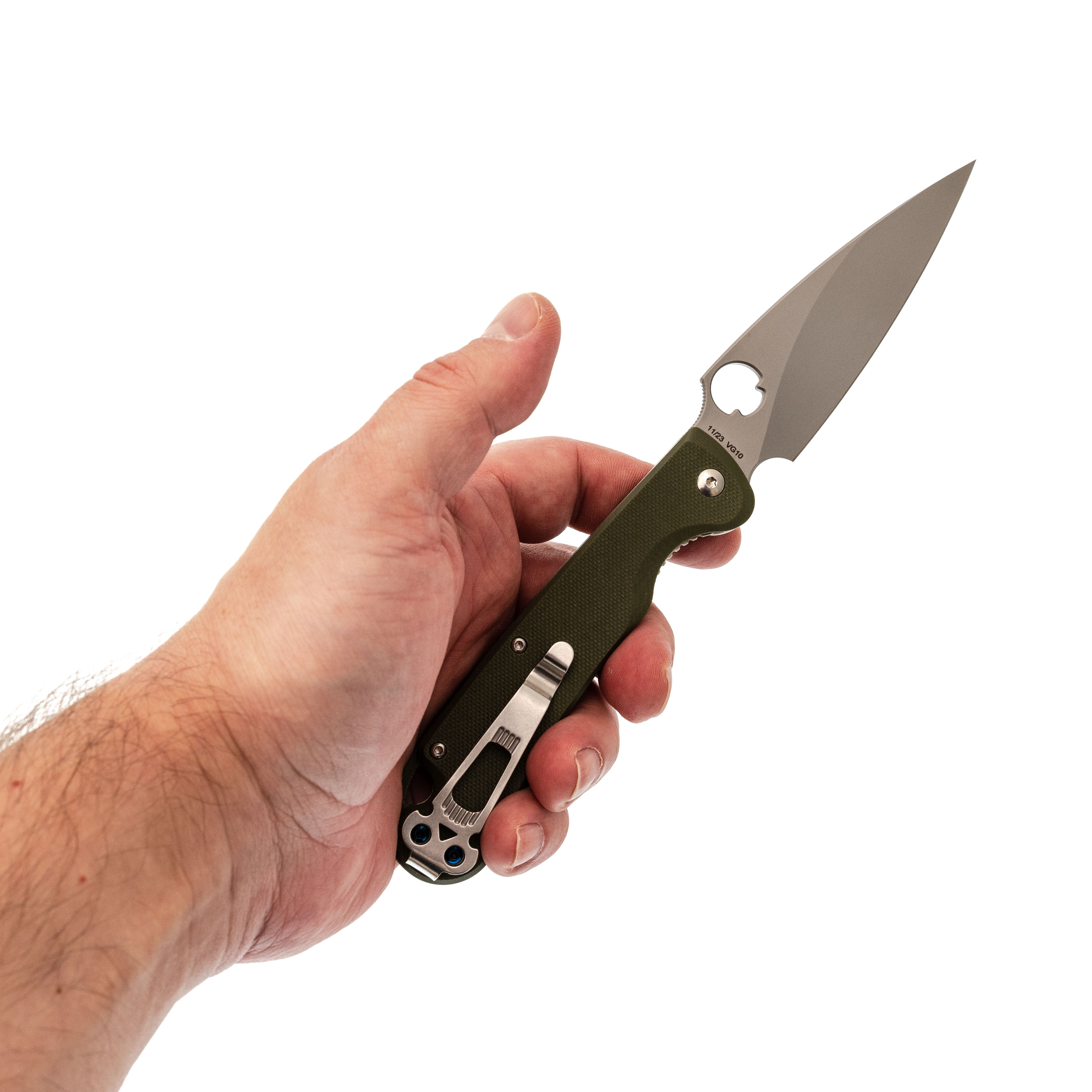 Профиль Spear-Point с высокими прямыми спусками даёт отличный рез и контроль. Кончик остаётся деликатным для аккуратных задач, а форма лезвия - универсальной. Фирменное отверстие в клинке используется для открытия, а замок Liner-Lock фиксирует всё надёжно и без люфта.