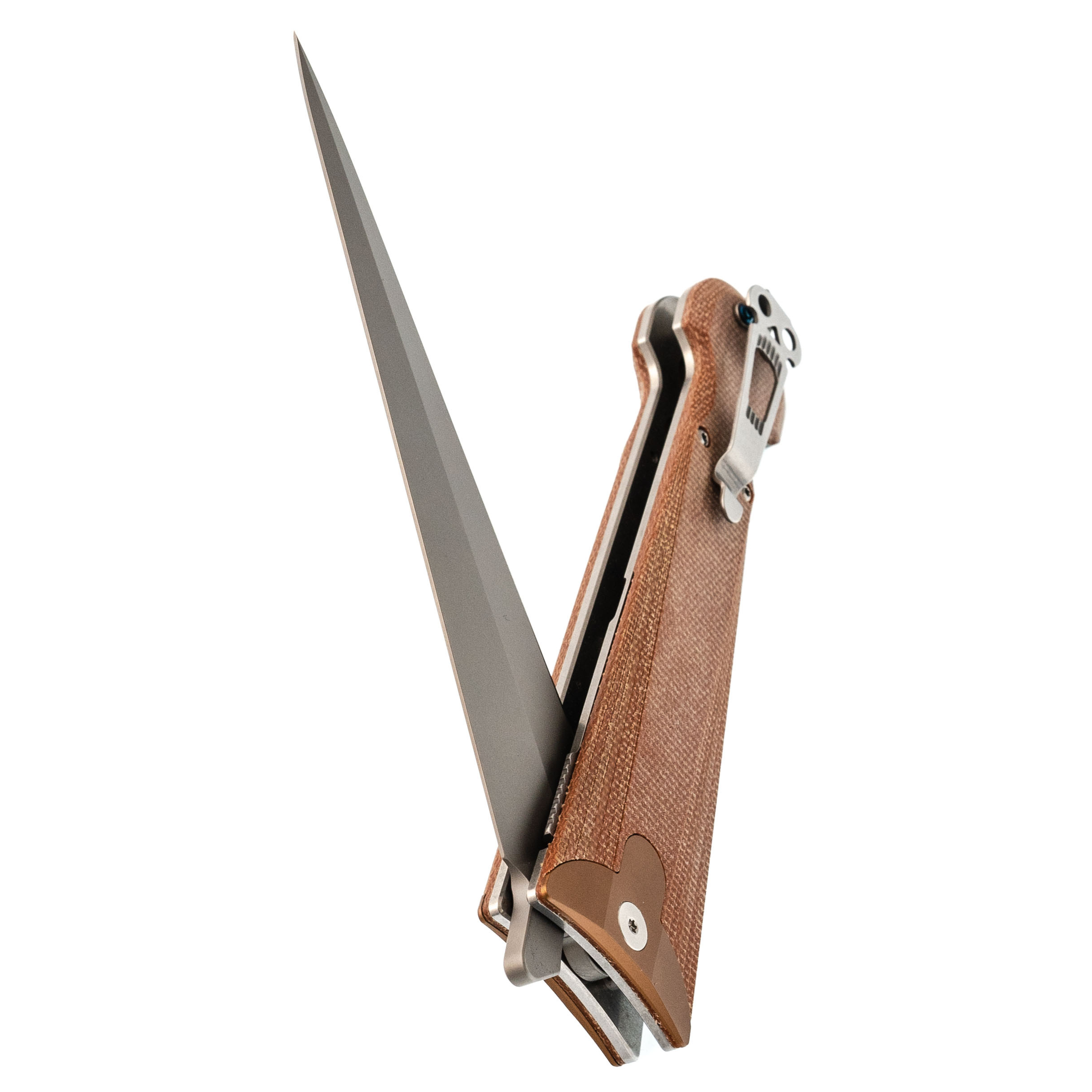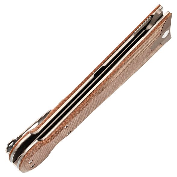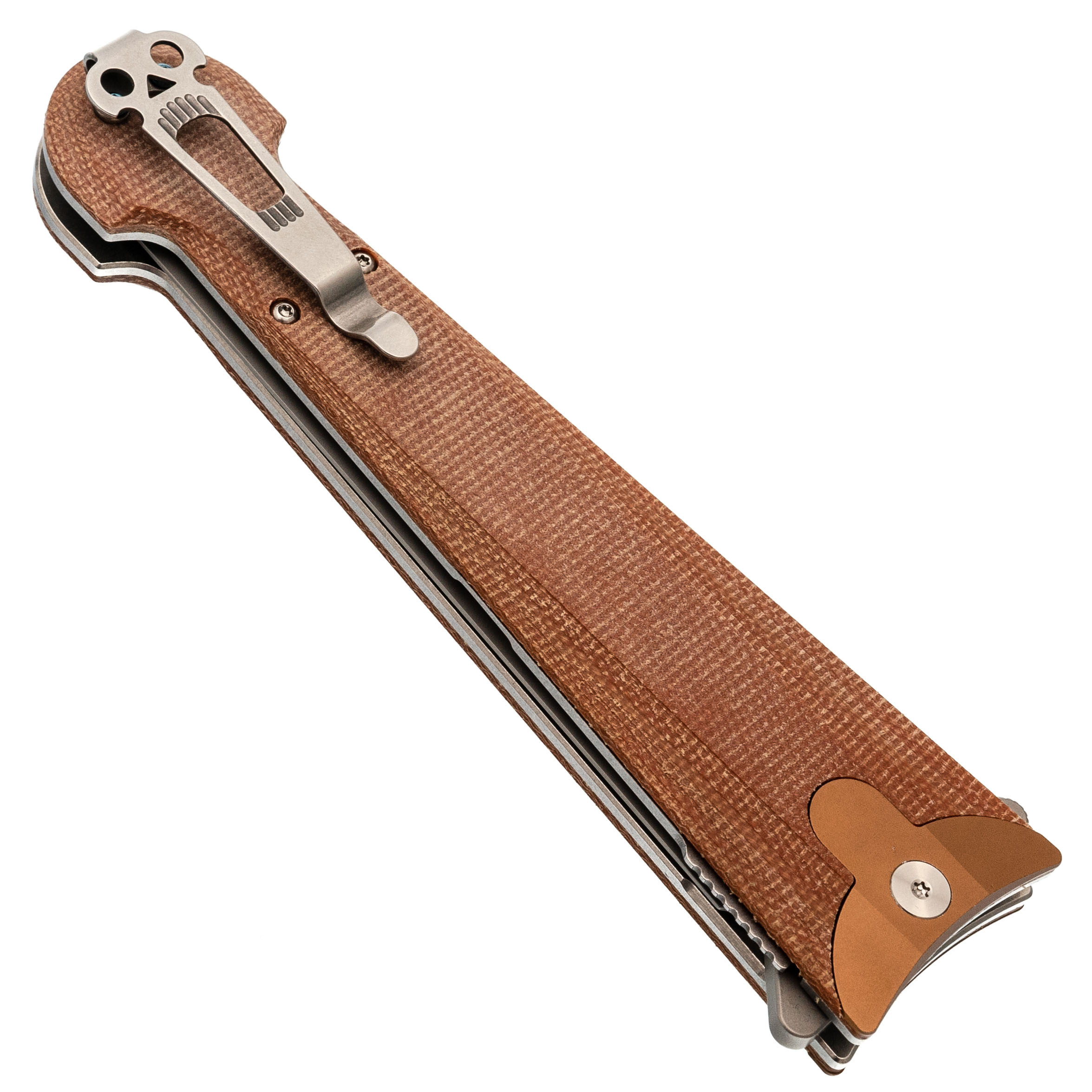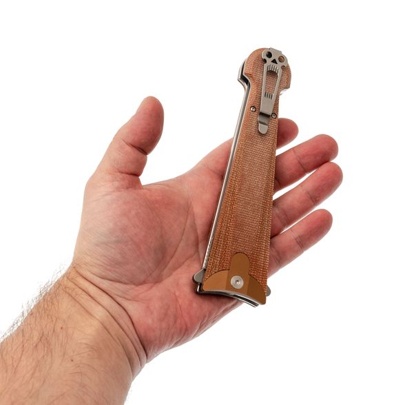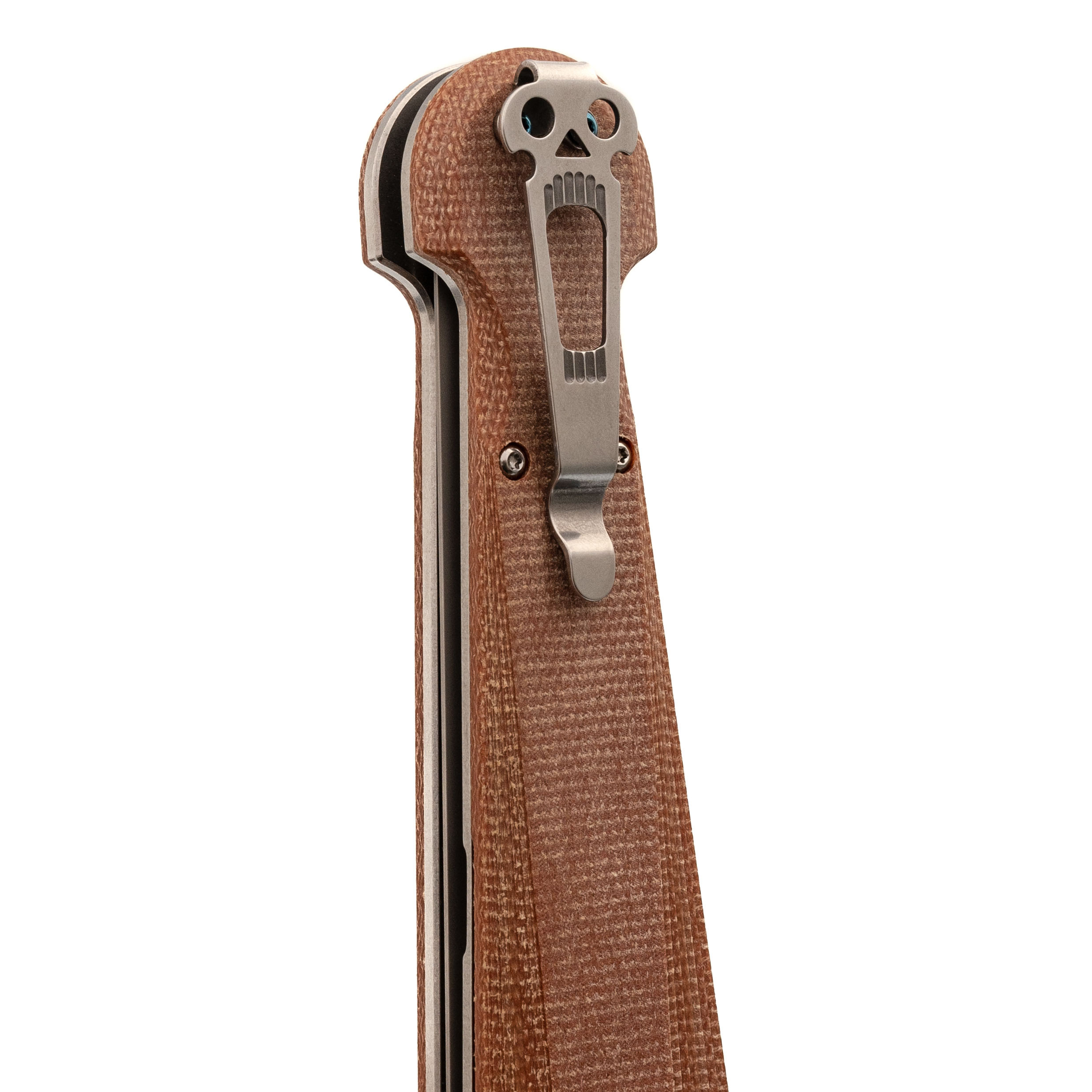 Форма рукояти плавно сужается к навершию, что делает хват естественным и устойчивым. Коричневая микарта добавляет тактильного комфорта и "живости" - материал словно подстраивается под ладонь. Клипса позволяет удобно закрепить нож в кармане, не утяжеляя посадку.