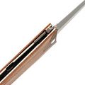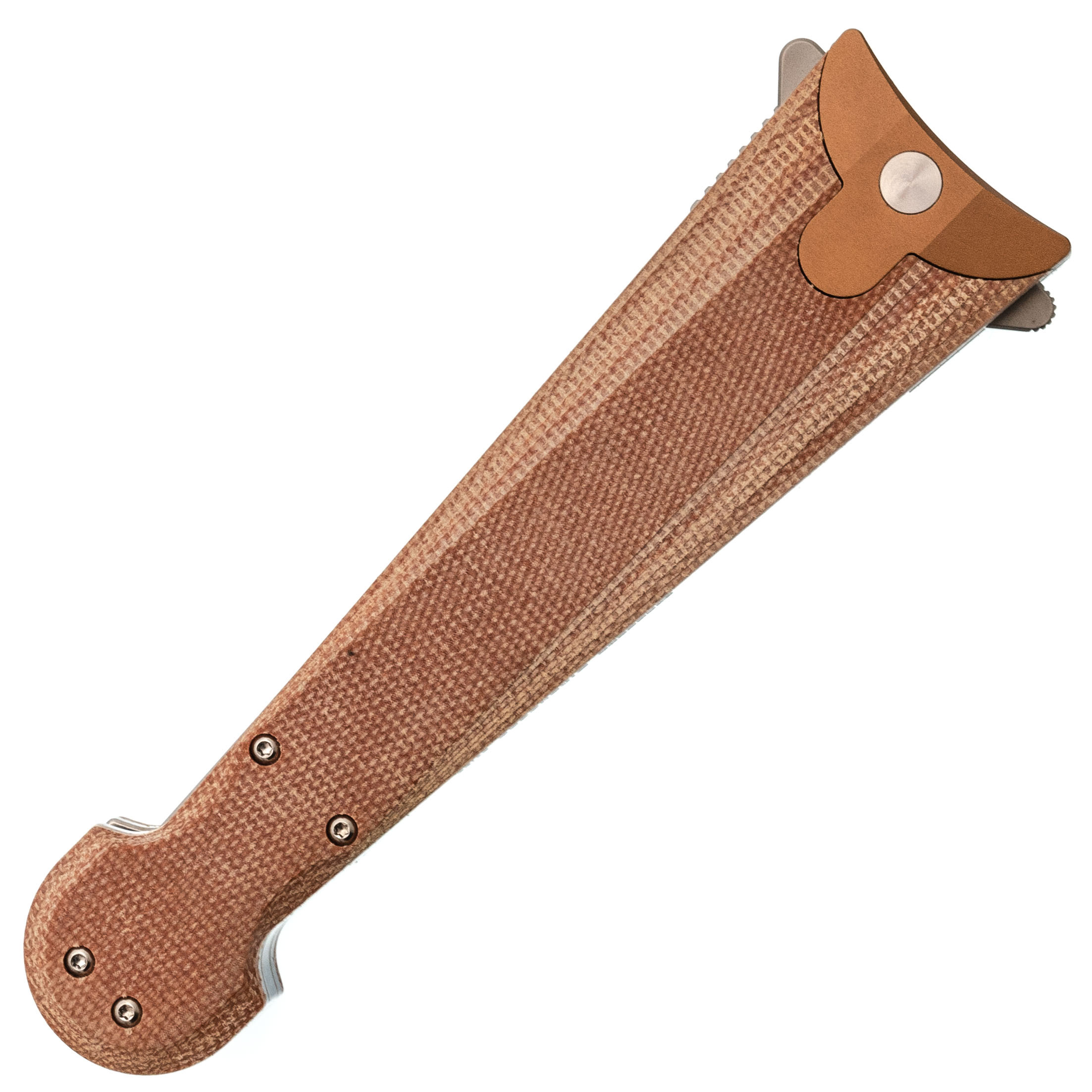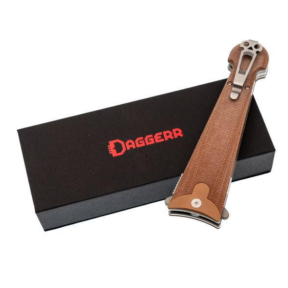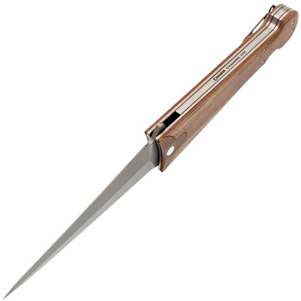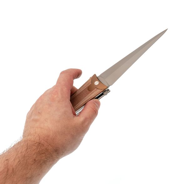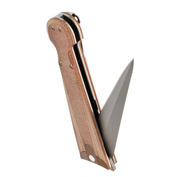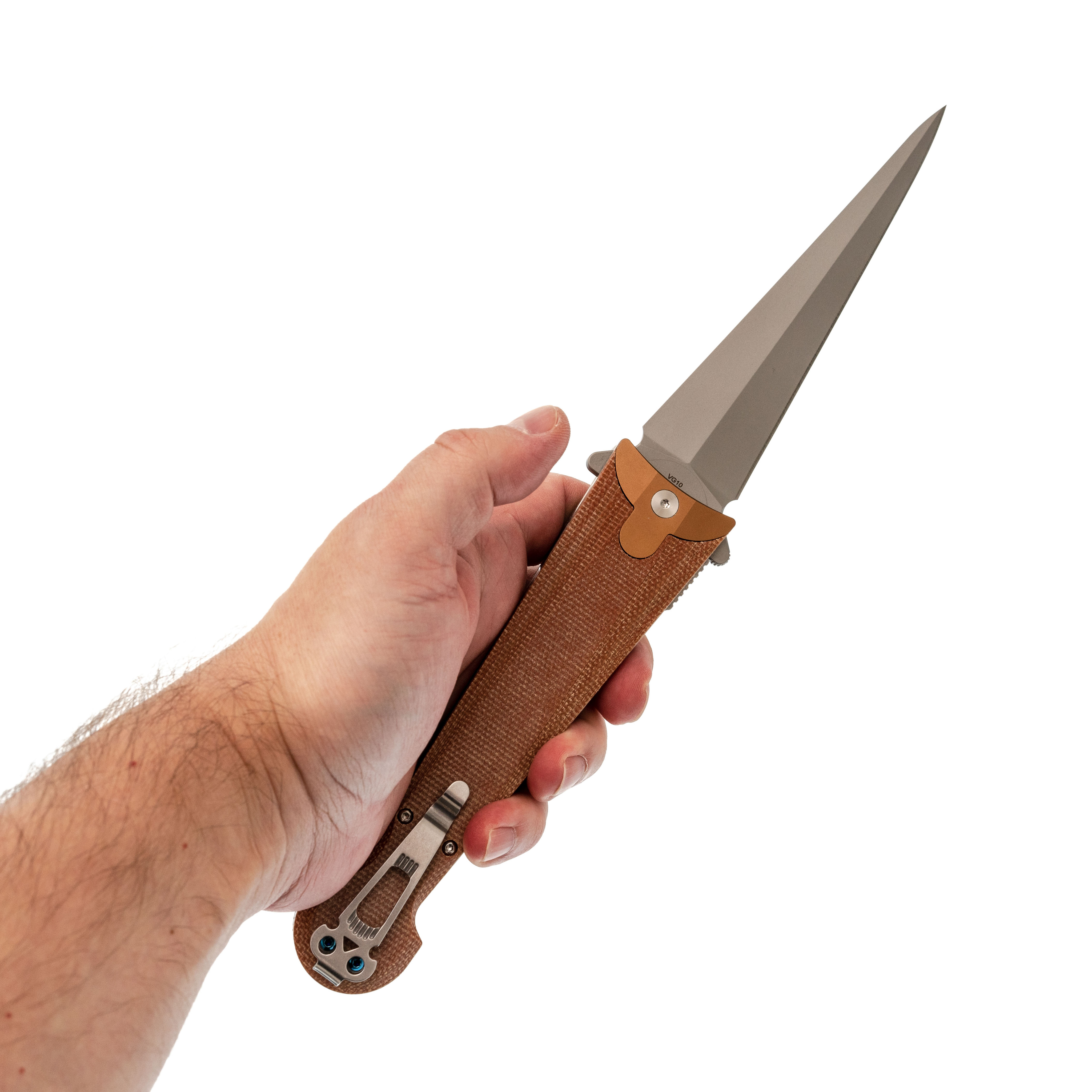 Форма рукояти плавно сужается к навершию, что делает хват естественным и устойчивым. Коричневая микарта добавляет тактильного комфорта и "живости" - материал словно подстраивается под ладонь. Клипса позволяет удобно закрепить нож в кармане, не утяжеляя посадку.