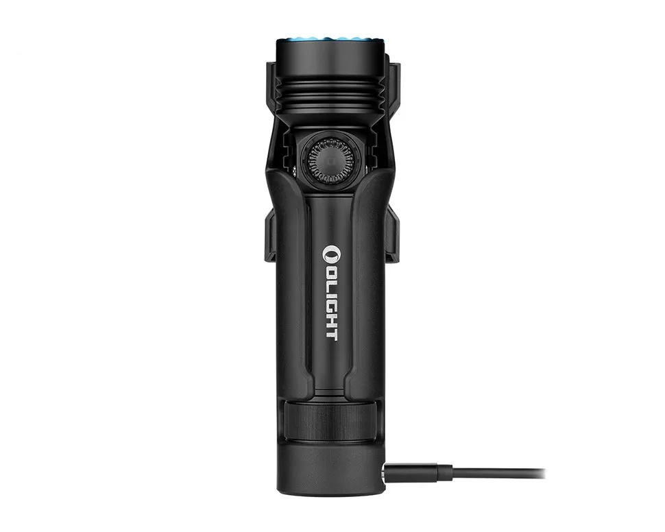 Питается Olight Seeker 4 Pro от съёмного аккумулятора Olight ORB-217C50 ёмкостью 5000 mAh - это современный стандарт, которого хватает надолго. Заряжается через магнитную зарядку Olight MCC3: просто поднёс кабель, он сам примагнитился, и процесс пошёл. В комплекте идёт не просто чехол на ремень, а полноценная зарядная станция. Вставляете фонарь в чехол, чехол подключаете через USB Type-C к любому источнику питания, и фонарь заряжается. Настенное крепление для этого чехла можно приклеить куда угодно на мощный двухсторонний скотч 3M - тот самый, что используют в авиации.