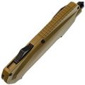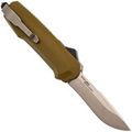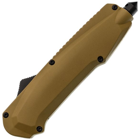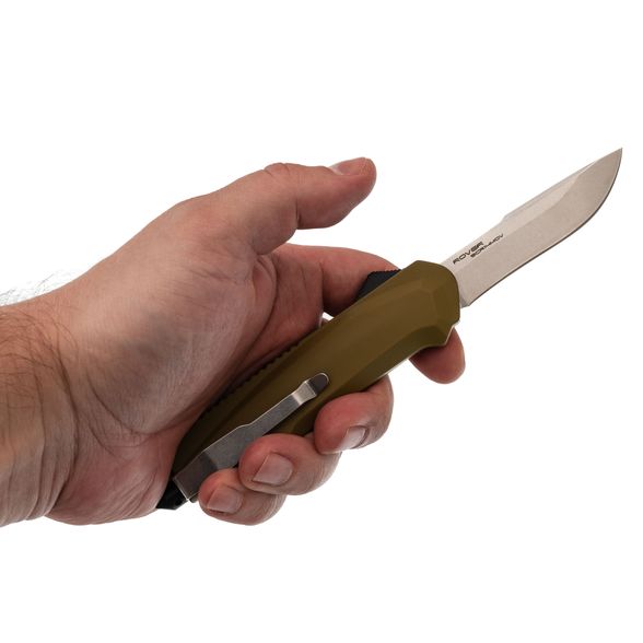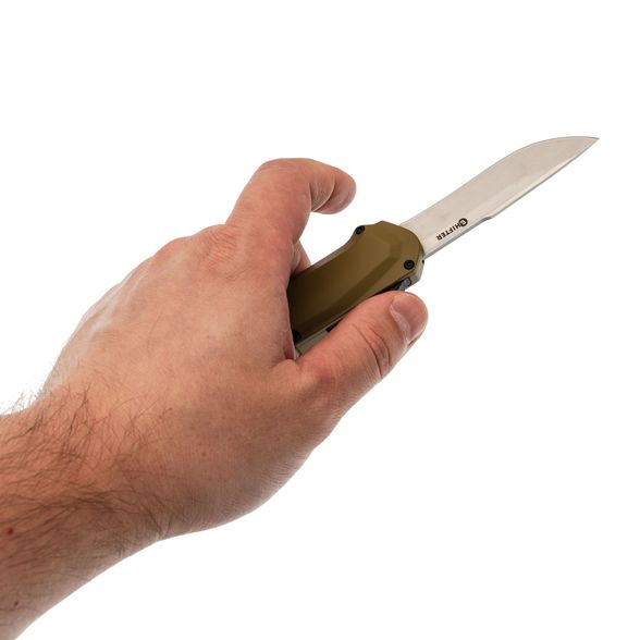 Клинок ножа выполнен в универсальной форме Drop-Point - она отлично подходит для большинства задач, включая точные разрезы и проколы. Углубление на режущей кромке в форме рекурвы улучшает рез за счёт увеличенной длины кромки в компактном размере. Это особенно полезно при работе с канатами, тканью и другими мягкими материалами. Надёжный автоматический механизм с фронтальным выбросом клинка срабатывает быстро и чётко, позволяя использовать нож одной рукой без лишних движений.