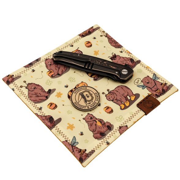 Название "хэнк" происходит от английского handkerchief - носовой платок, но современный вариант давно вышел за пределы этого простого значения. Сегодня это удобный и стильный аксессуар, который приятно держать под рукой. У модели Медовые Мишки от мастерской Grey Raven на лицевой стороне множество забавных персонажей: мишки с горшочками мёда, мишки-пчёлки и другие яркие детали, которые хочется рассматривать снова и снова. На обороте - мягкая искусственная замша, а небольшой кожаный ярлычок с логотипом добавляет аккуратный штрих к дизайну.