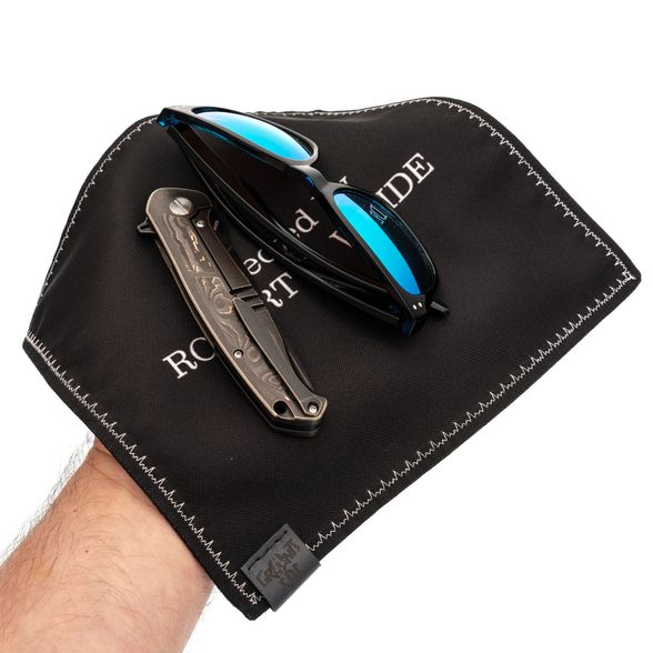 Искусственная замша с изнанки. Нежно полирует сталь, линзы и экраны, не оставляет ворс и разводы, даёт лёгкое цепление на столе, чтобы платок не скользил.