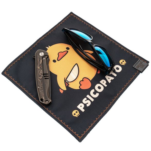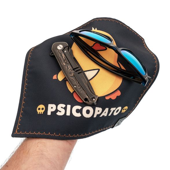 Слово hank пришло из английского handkerchief - носовой платок, но сегодня в EDC-мире это удобная салфетка-коврик на все случаи жизни. Здесь - жизнерадостный дизайн: милая уточка с ножом и надпись Psicopato - ироничная игра со словом психопат, которая добавляет характер без лишнего драматизма. Акцент дополняет аккуратная кожаная бирка с логотипом Grant EDC.