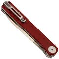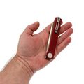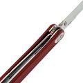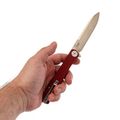 Она нейтральная, без вырезов под пальцы. Это плюс: рукоять подстраивается под любую анатомию, можно держать и прямым, и обратным хватом. Поверхность текстолита чуть шершавая, но не наждачная - карман не протирает. В руке сидит как влитая благодаря ширине и лёгкой бочкообразности. Замок Liner-Lock традиционно прост и надёжен: разблокировка одной рукой, фиксация жёсткая, люфта нет.