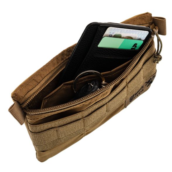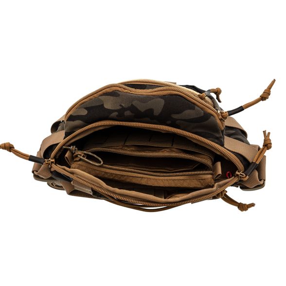 Основное отделение закрывается на молнию. Внутри - велкро-панель 10×17,5 см для крепления модулей, тканевая перегородка и петля из паракорда для страховки мелочей. Снаружи - организация из резиновых лент шириной 25 и 50 мм: 3 больших секции по 6 см и 6 малых по 3 см, чтобы развести предметы по размеру. Внизу предусмотрены 3 кармана-"стопора" по 6 см - они подпирают содержимое снизу и помогают избежать выпадения, а заодно подходят для самых мелких вещей.