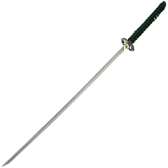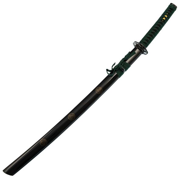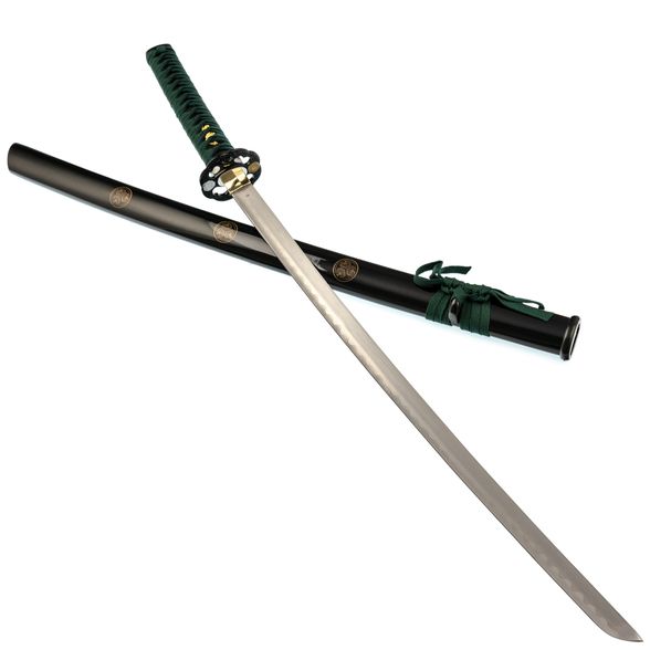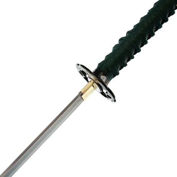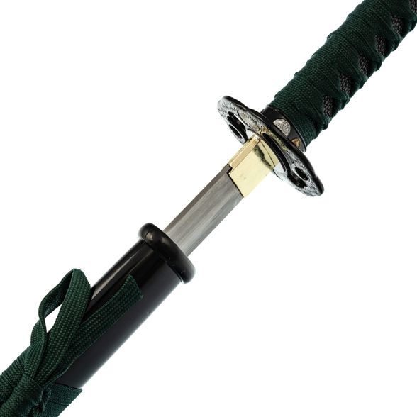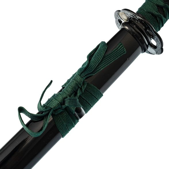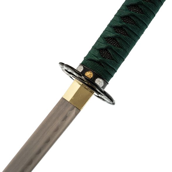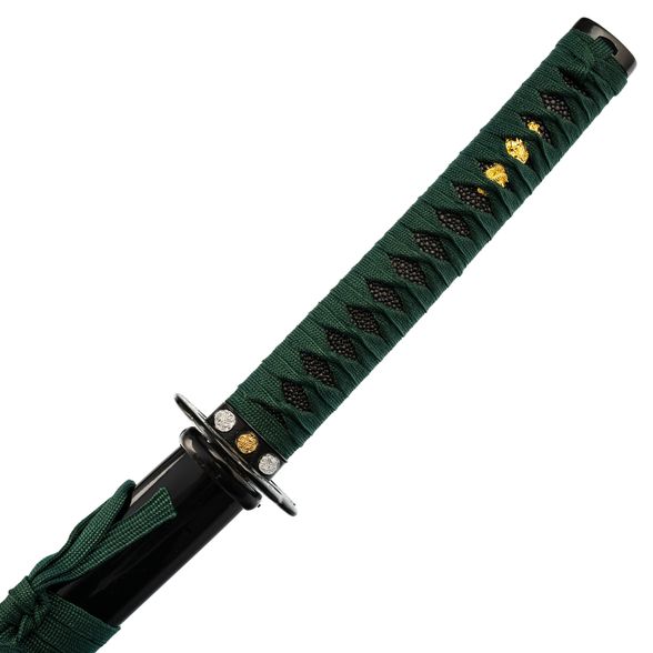 Катана украшена стильной зелёной обмоткой рукояти (цука-ито) с золотистыми акцентами.