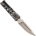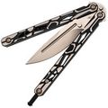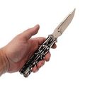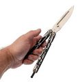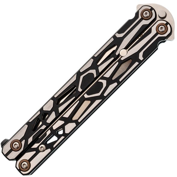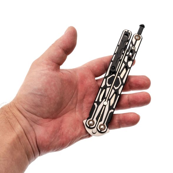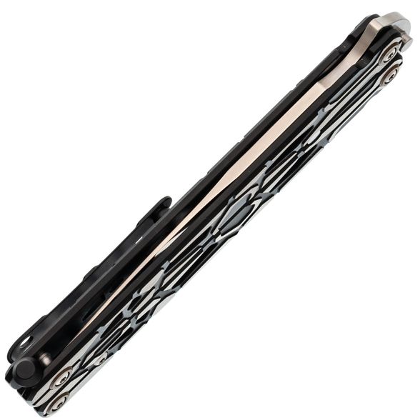 Рукоять, как и у всех балисонгов, состоит из двух стальных частей, что гарантирует прочность и надежность. Латч удерживается пружиной, что позволяет ему не мешаться при открытии и закрытии ножа. Рукоять оснащена клипсой для ношения на кармане, что делает ношение удобным. Клипса имеет шарик, предотвращающий излишнее трение и повреждение ткани кармана, что является приятным дополнением, демонстрирующим внимание производителя к деталям.