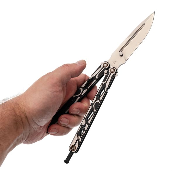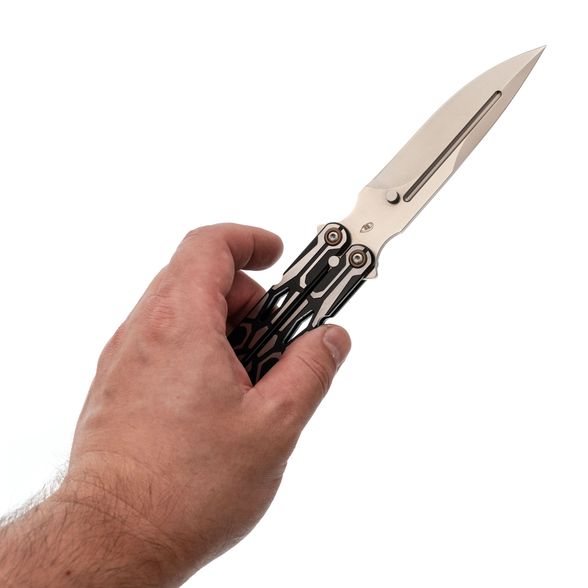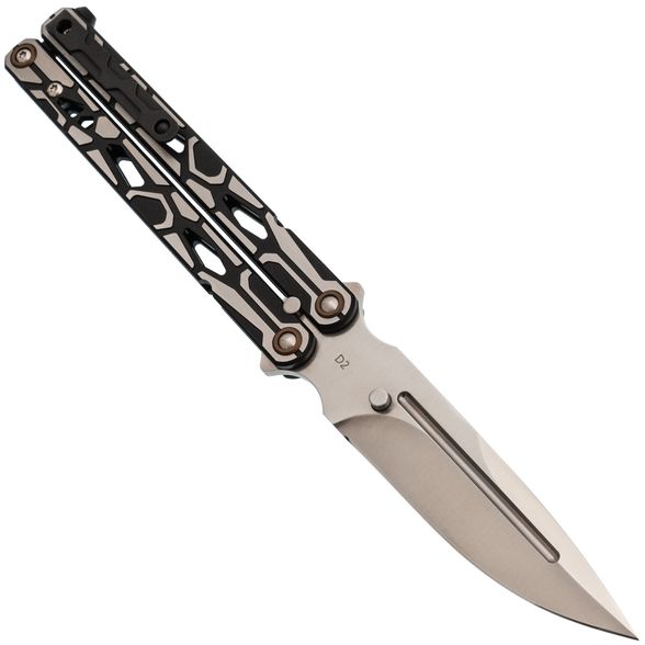 Клинок балисонга имеет форму Drop-Point, которая считается одной из самых универсальных и практичных. Такой профиль позволяет выполнять различные задачи с максимальным комфортом. Высокие спуски, характерные для серии Киборгов, обеспечивают отличные режущие характеристики, делая нож идеальным для повседневного использования. Сталь D2, из которой изготовлен клинок, является высокоуглеродистой и обеспечивает оптимальное сочетание остроты и долговечности, что делает ее популярной среди любителей ножей.